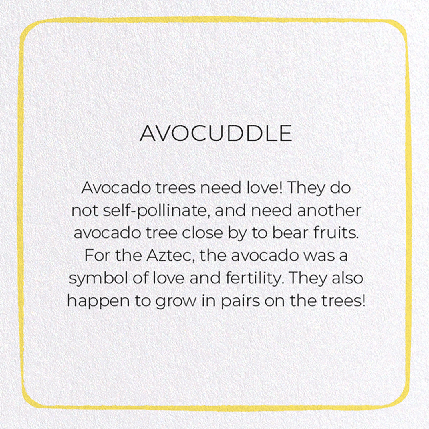 Avocado trees need love! They do not self-pollinate, and need another avocado tree close by to bear fruits. For the Aztec, the avocado was a symbol of love and fertility. They also happen to grow in pairs on the trees!