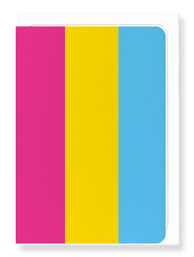 Text on the reverse side: Created in 2010, the flag represent pansexuality, symbolising interest in all genders as partners. The colours represent:...