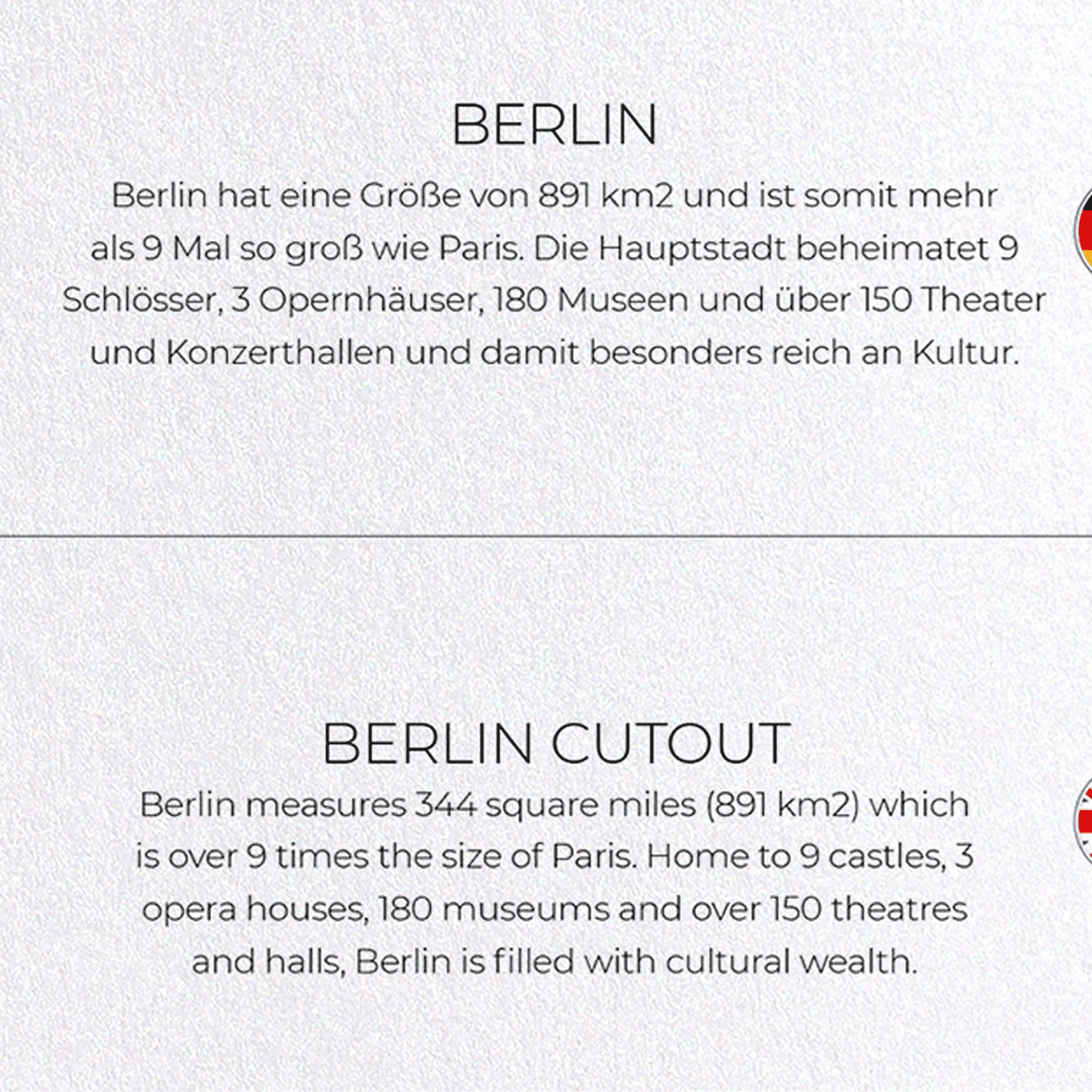 Berlin measures 344 square miles (891 km2) which is over 9 times the size of Paris. Home to 9 castles, 3 opera houses, 180 museums and over 150 theatres and halls, Berlin is filled with cultural wealth.