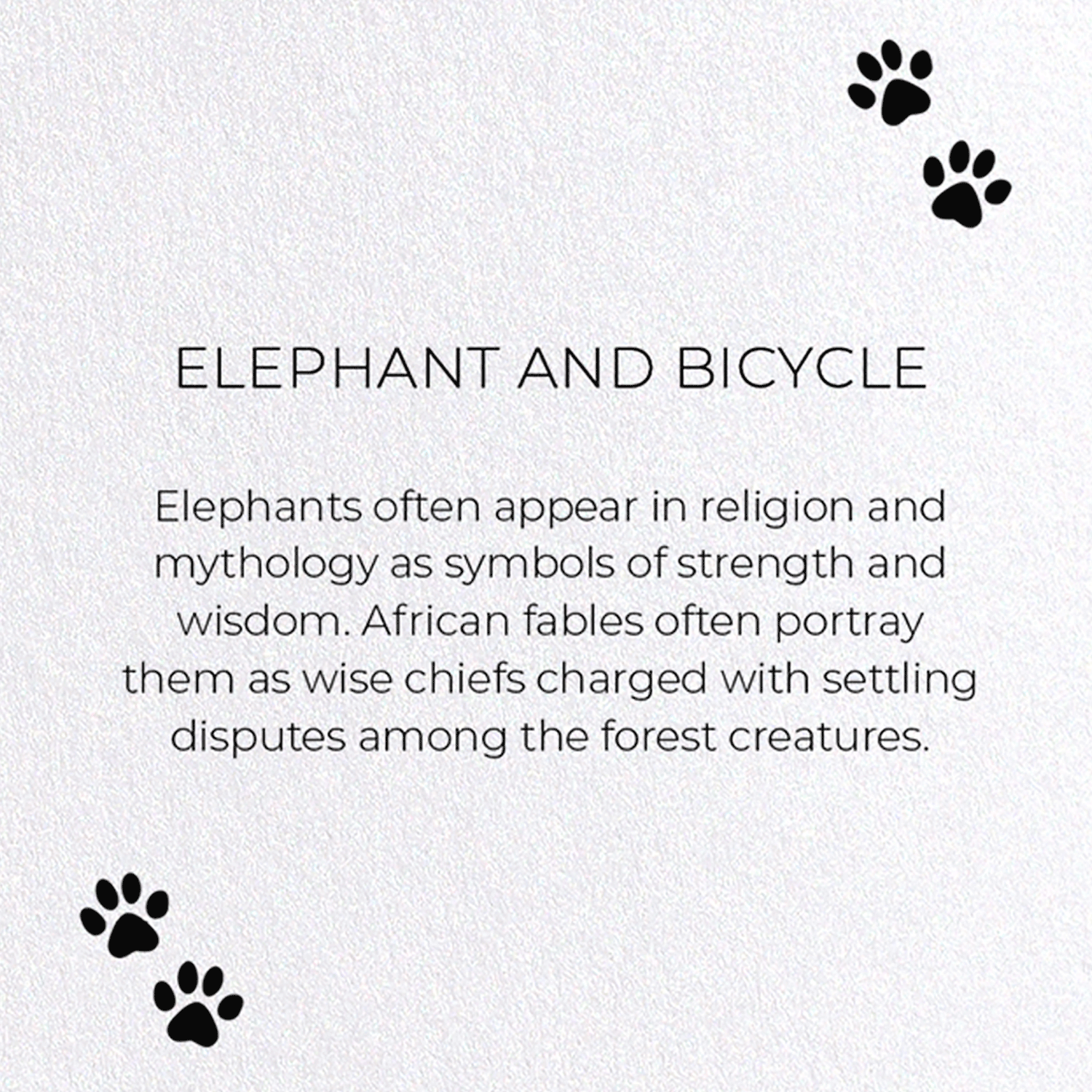 Elephants often appear in religion and mythology as symbols of strength and wisdom. African fables often portray them as wise chiefs charged with settling disputes among the forest creatures.