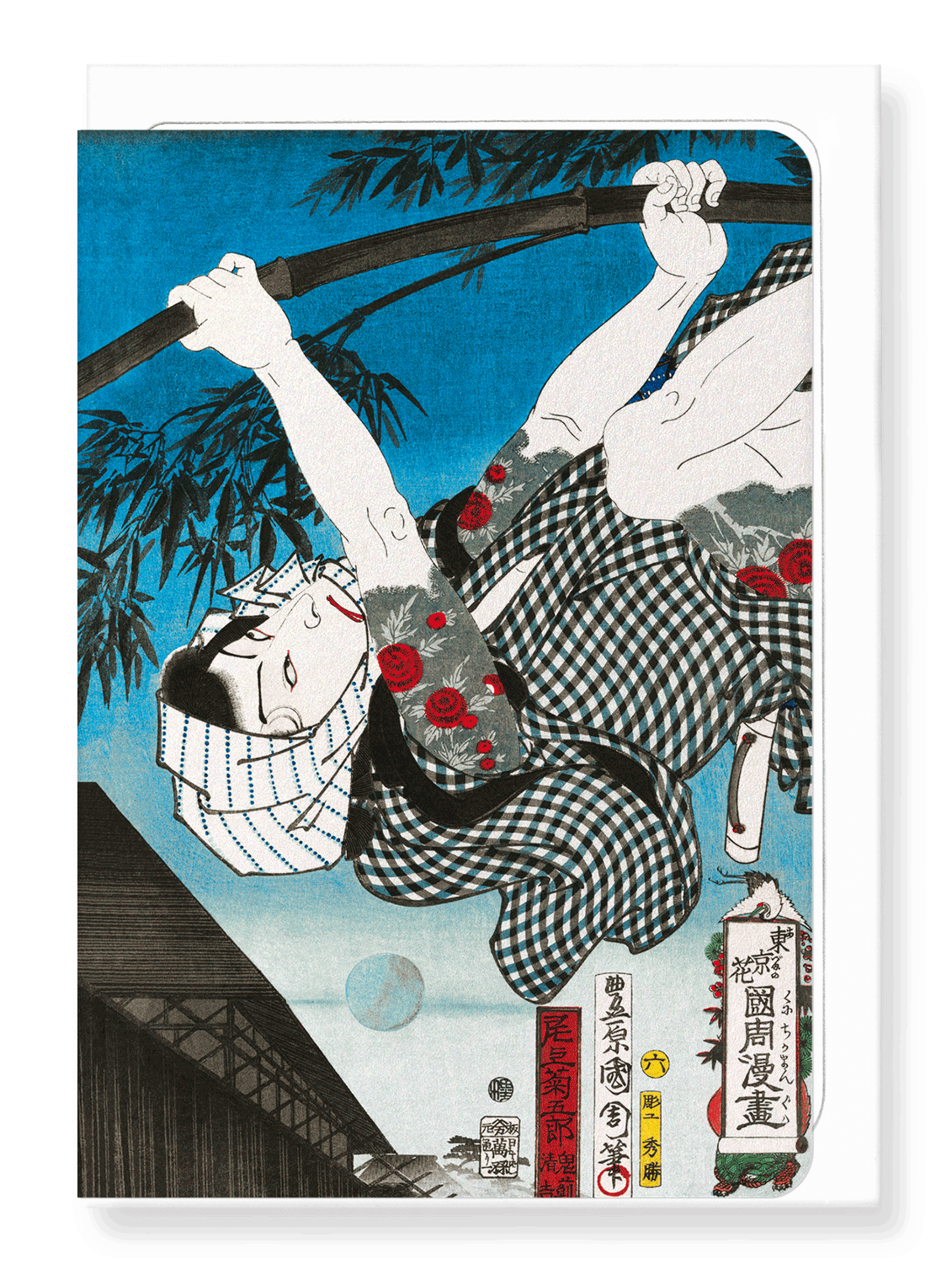 Actor Kikugoro V in the role of Oniazami Seikichi, hanging from a bamboo upside down, depicted with plumed thistle tattoos. No. 6 from the series Flowers of Tokyo: Kunichika's Caricatures.