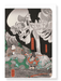 Part of a triptych image, a skeleton spectre, summoned by Princess Takiyasha, looms over to menace warrior Oya no Mitsukuni and his companion.