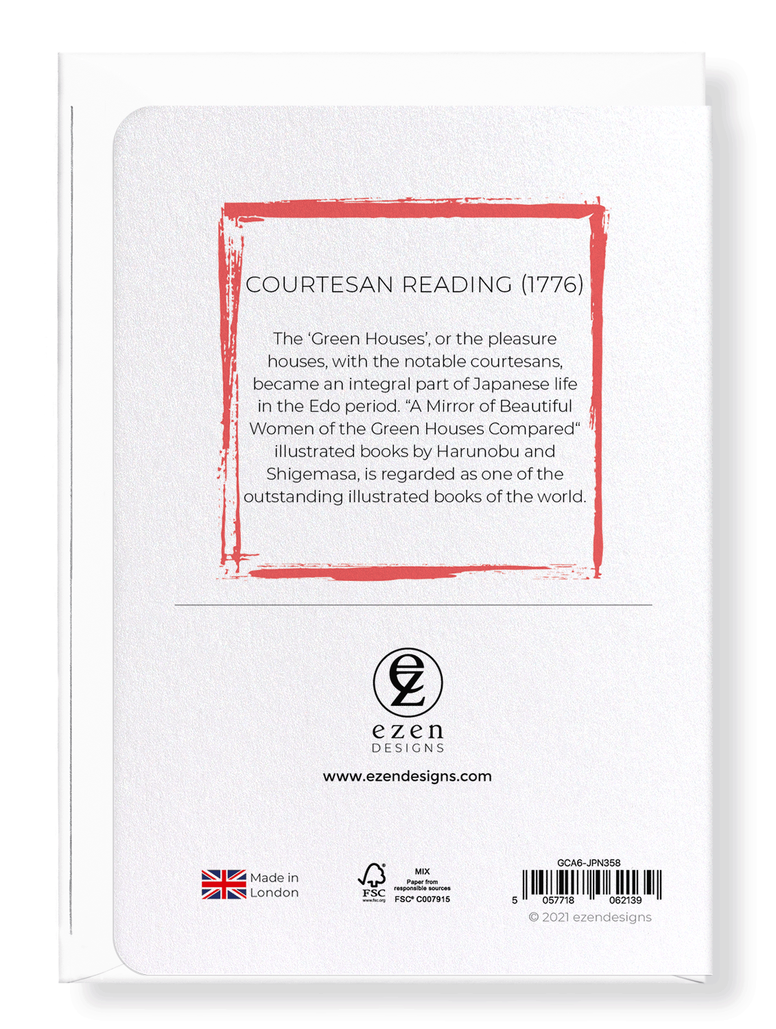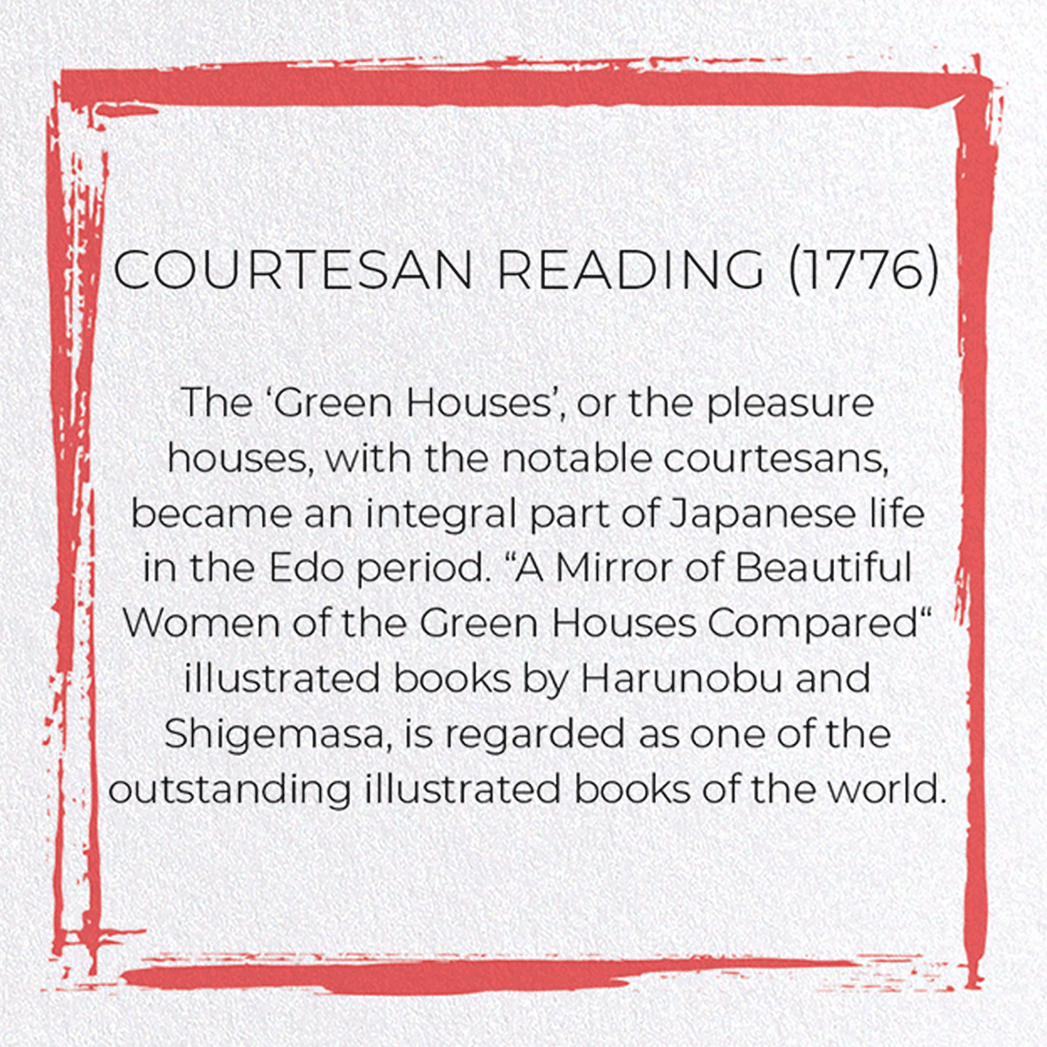 The 'Green Houses', or the pleasure houses, with the notable courtesans, became an integral part of Japanese life in the Edo period. “A Mirror of Beautiful Women of the Green Houses Compared“ illustrated books by Harunobu and Shigemasa, is regarded as one of the outstanding illustrated books of the world.
