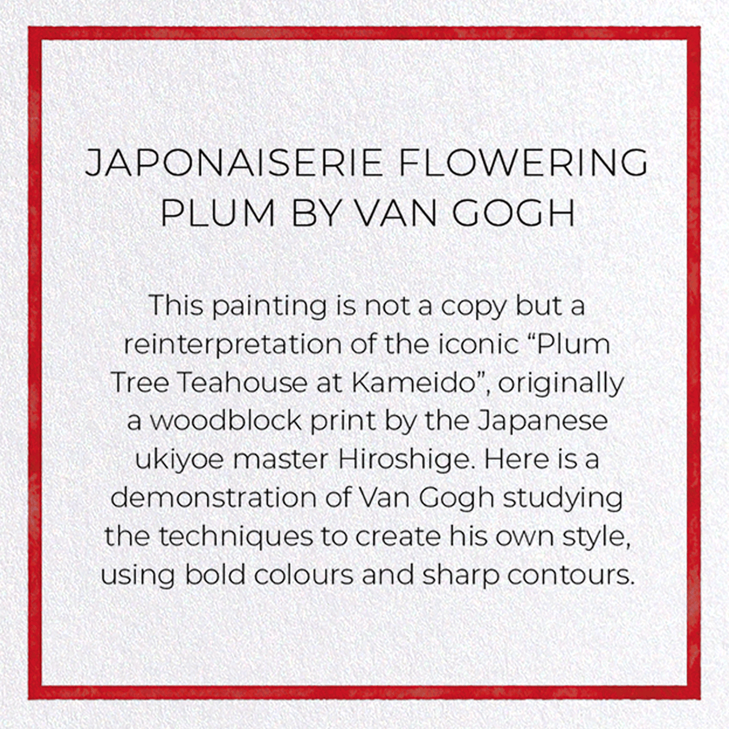 This painting is not a copy but a reinterpretation of the iconic “Plum Tree Teahouse at Kameido”, originally a woodblock print by the Japanese ukiyoe master Hiroshige. Here is a demonstration of Van Gogh studying the techniques to create his own style, using bold colours and sharp contours.