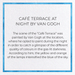 The scene of the “Café Terrace” was painted by Van Gogh at the location, where he opted to paint during the night in order to catch a glimpse of the different quality of colours in the gas-lit darkness. According to him, the yellow and orange of the lamps intensified the blue of the sky.