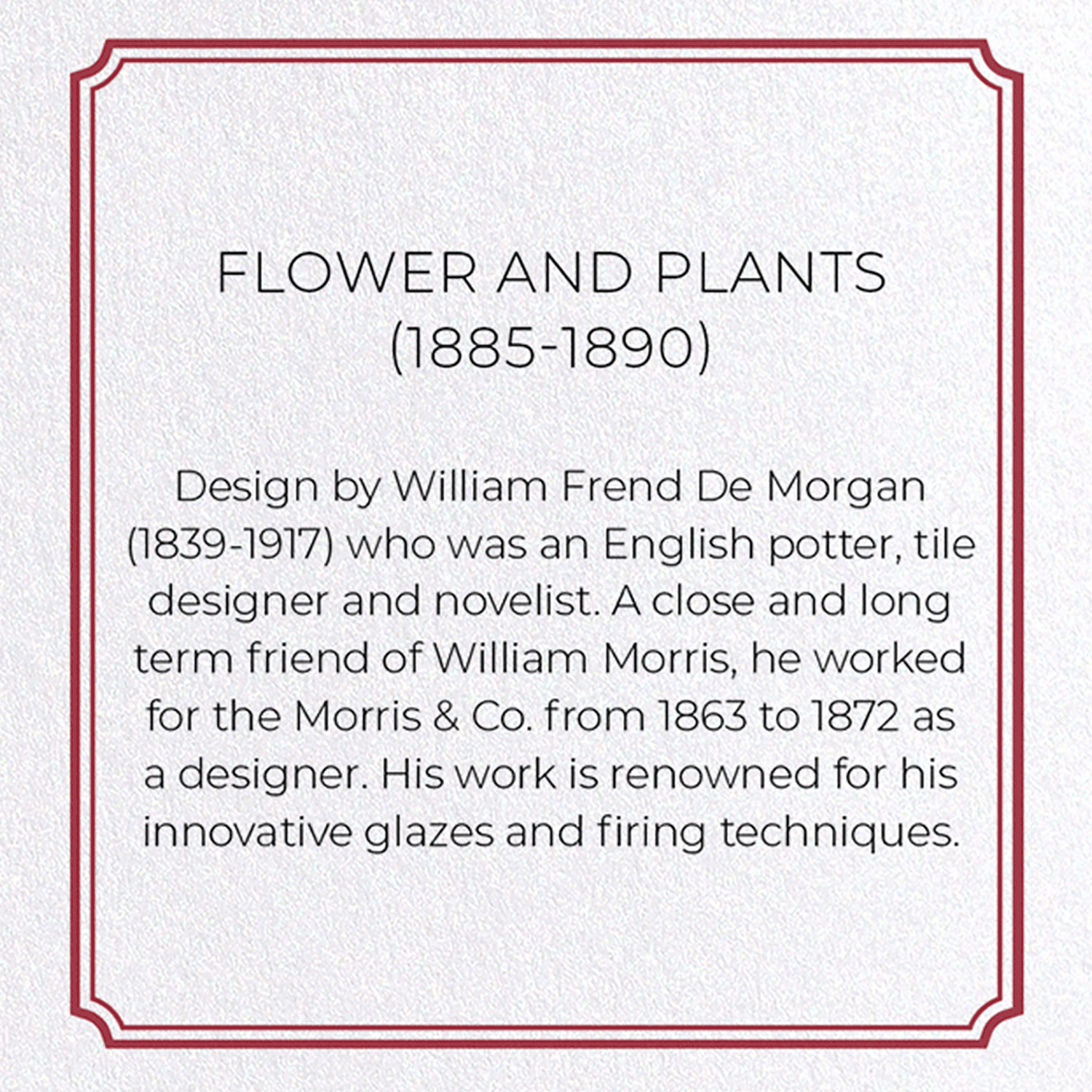 Design by William Frend De Morgan (1839-1917) who was an English potter, tile designer and novelist. A close and long term friend of William Morris, he worked for the Morris & Co. from 1863 to 1872 as a designer. His work is renowned for his innovative glazes and firing techniques.