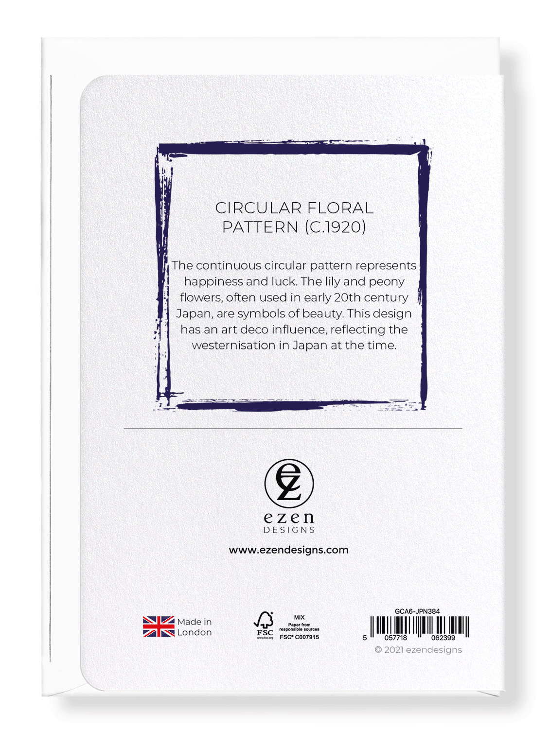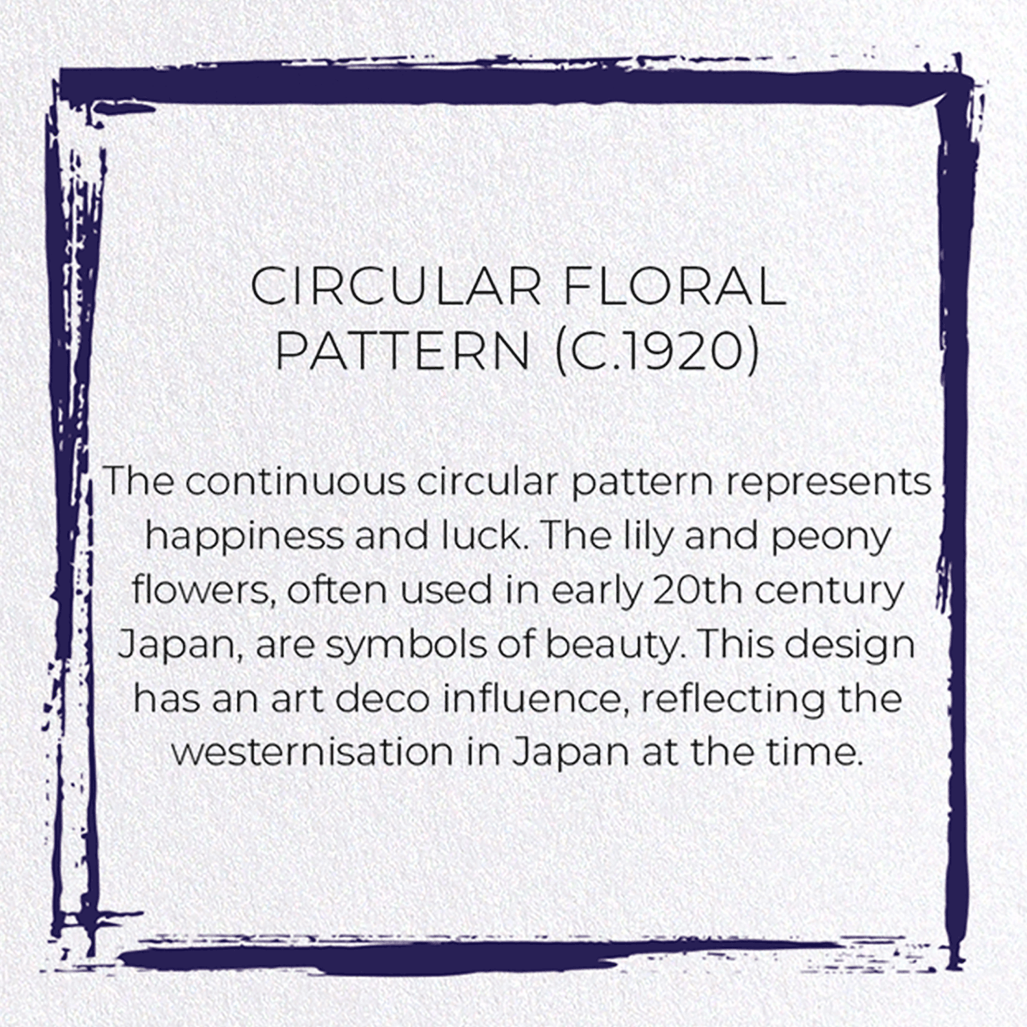 The continuous circular pattern represents happiness and luck. The lily and peony flowers, often used in early 20th century Japan, are symbols of beauty. This design has an art deco influence, reflecting the westernisation in Japan at the time.