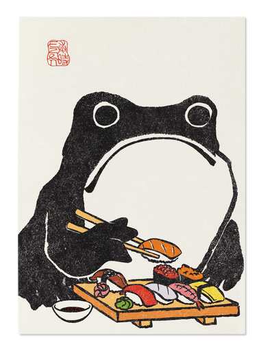 Text on the reverse side: A contemporary ramen adaptation of a Japanese woodblock print dating 1814. The Japanese word for frog is “kaeru”, which c...