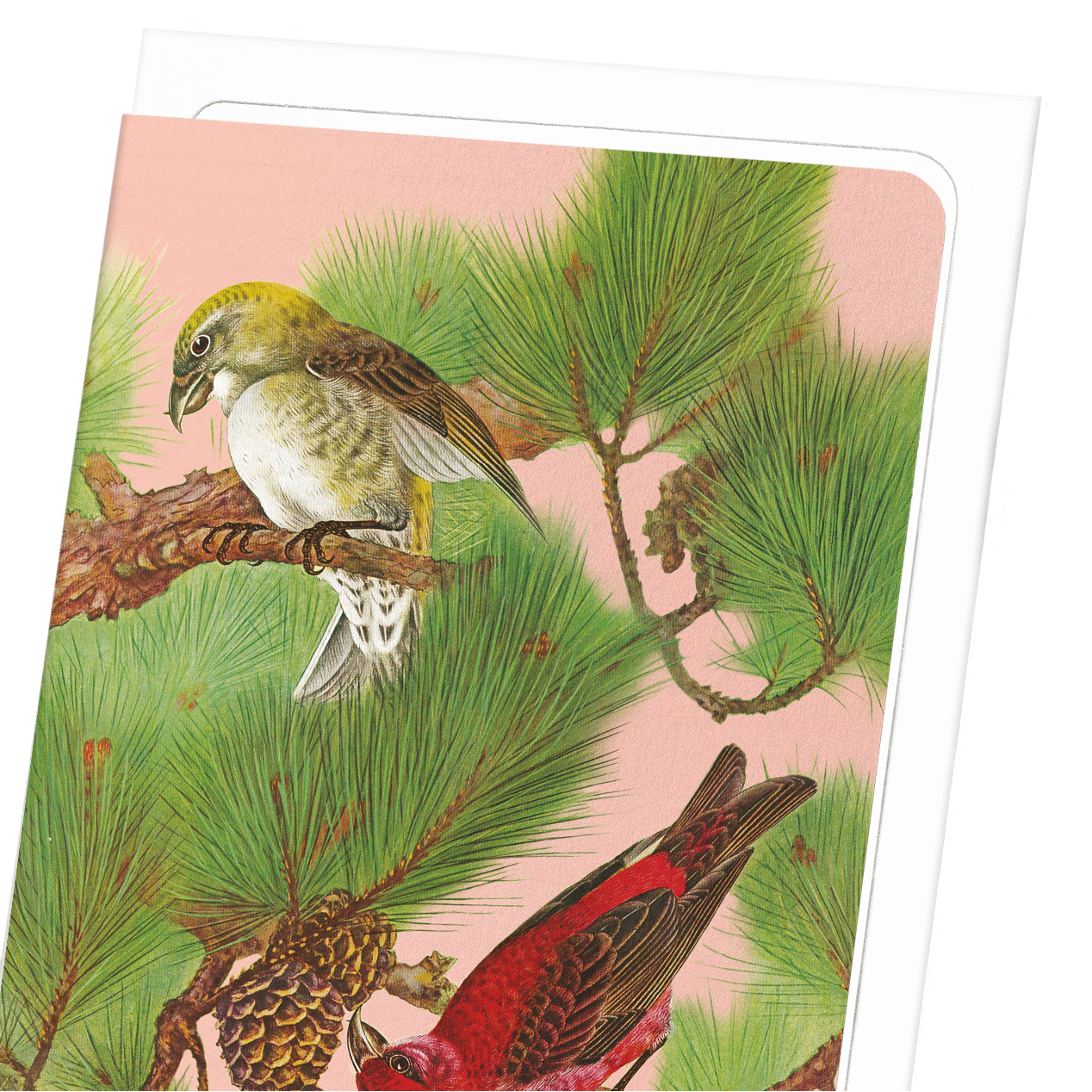 COMMON CROSSBILL BIRDS ON PINE TREE (C.1930): Japanese Greeting Card