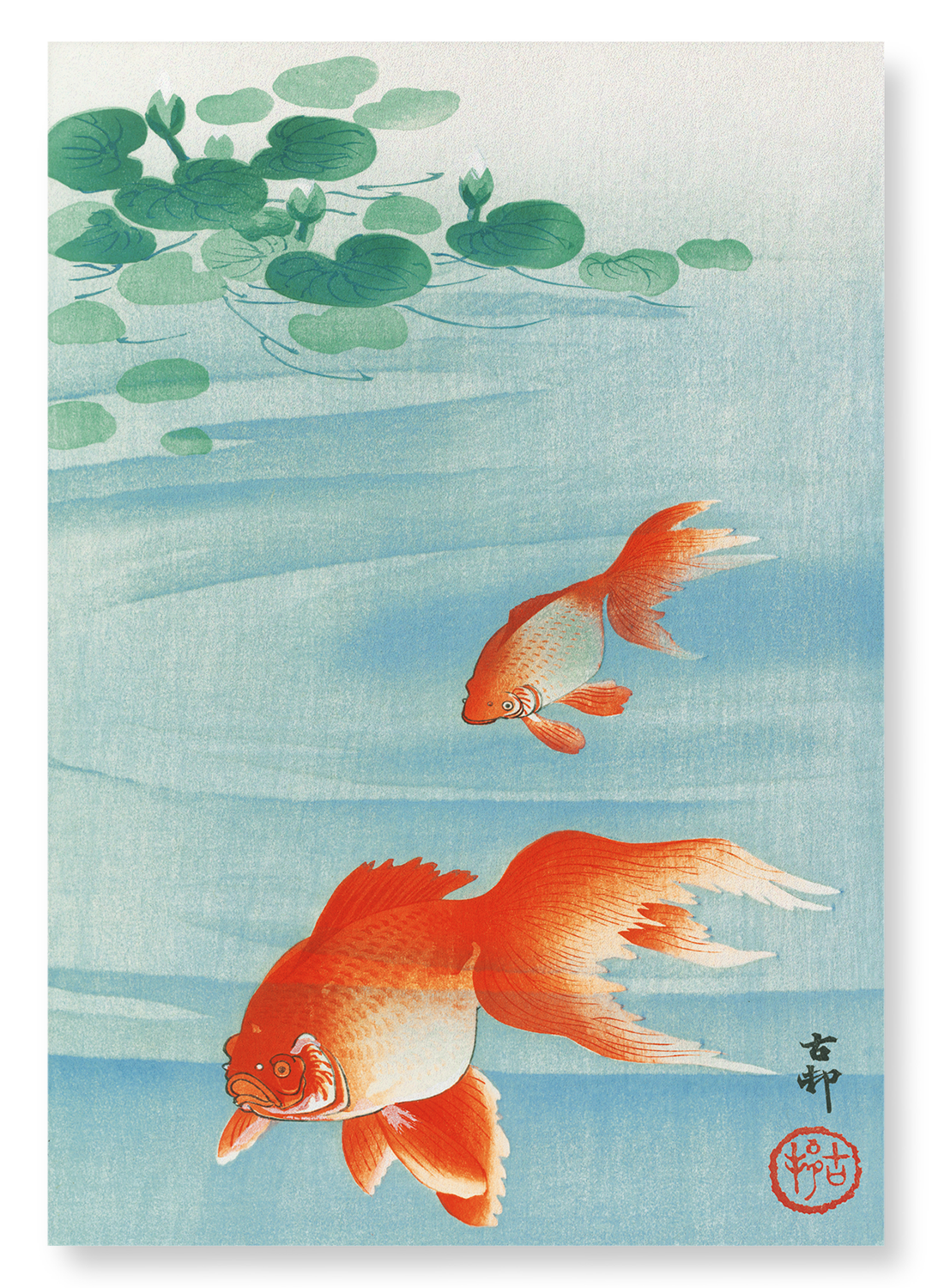 The goldfish has also come to symbolise wealth in Chinese culture stemming from the fact that the Chinese word for fish (yú) is pronounced very similarly (but in a different tone) to the word for wealth. By Ohara Koson (1877-1945).