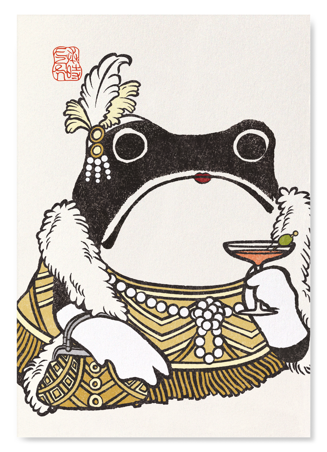 A contemporary Lady Gatsby adaptation of a Japanese woodblock print dating 1814. The Japanese word for frog is “kaeru”, which can also mean “to return”, so the frog is considered to bring good luck, representing good things returning.