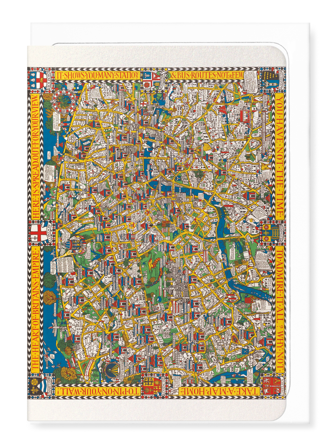 The border caption reads: "The heart of Britain's empire here is spread out for your view, it shows you many stations & 'bus routes not a few. You have not the time to admire it all? Why not take a map home to pin on your wall!"
