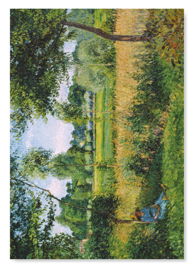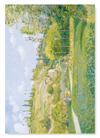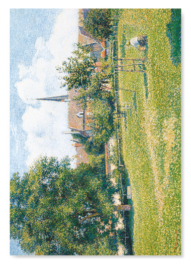 Text on the tag: This piece was painted in Pissarro’s village home in Normandy, after he moved there in 1884. The painting depicts the rural tranq...