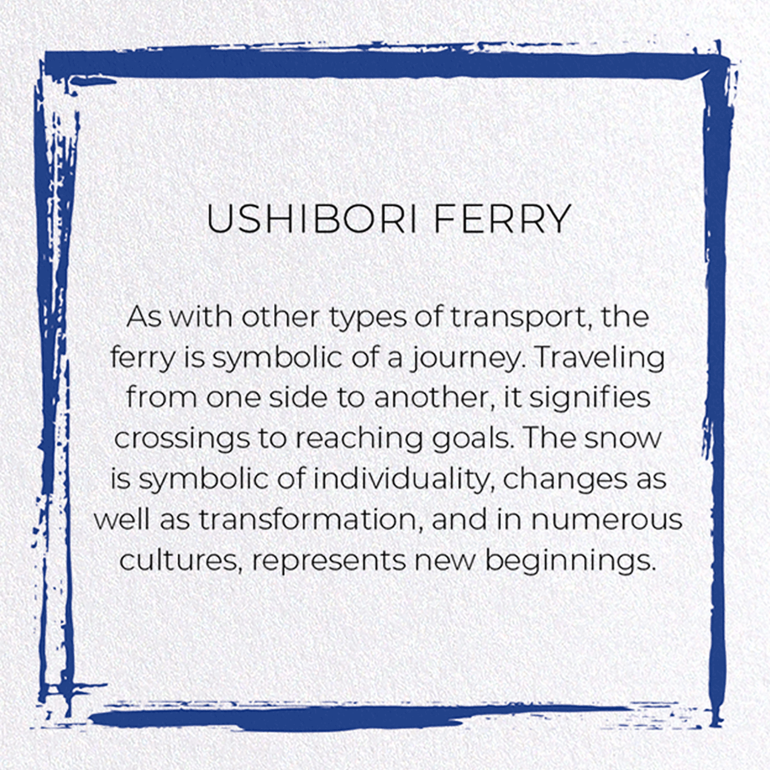 As with other types of transport, the ferry is symbolic of a journey. Traveling from one side to another, it signifies crossings to reaching goals. The snow is symbolic of individuality, changes as well as transformation, and in numerous cultures, represents new beginnings.