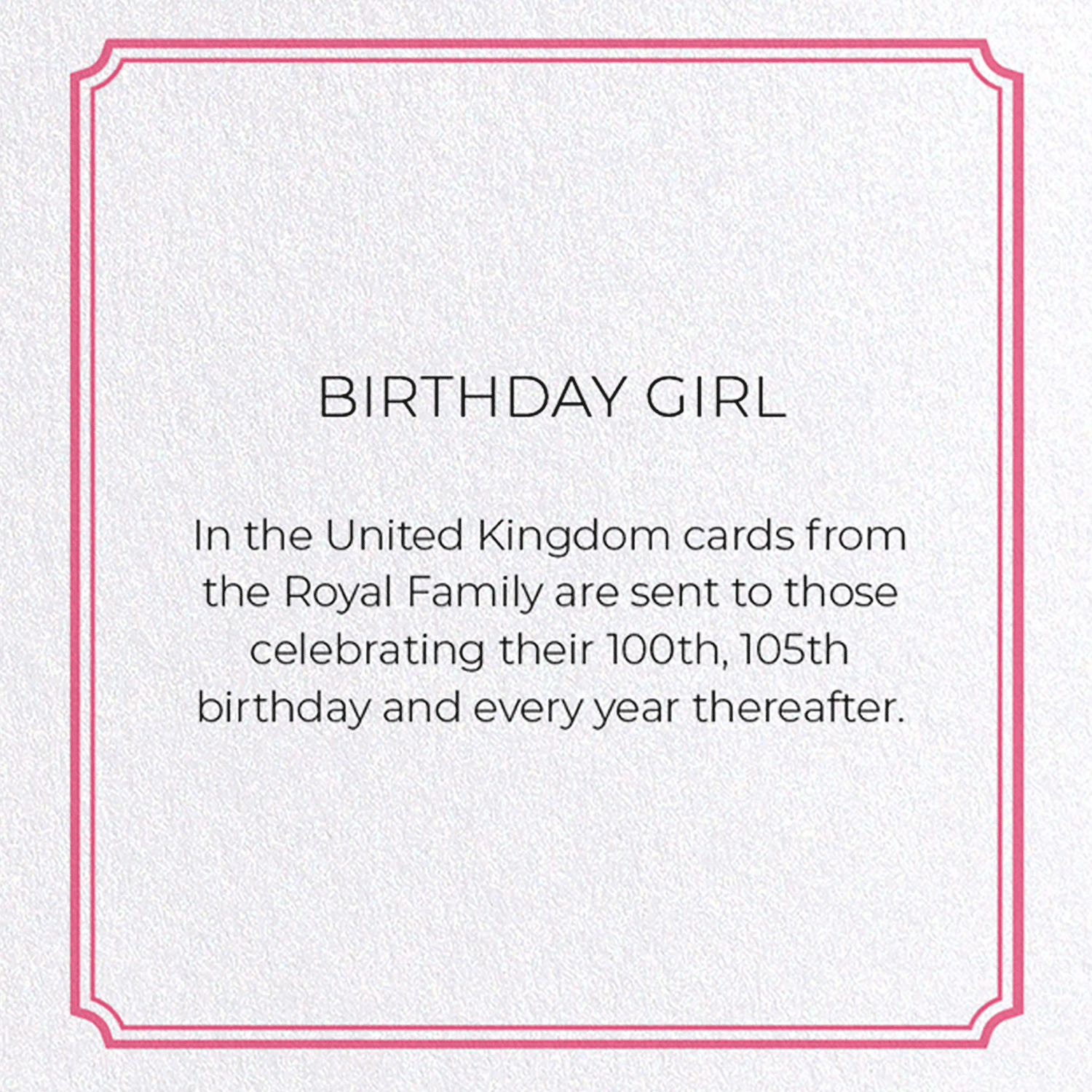 In the United Kingdom cards from the Royal Family are sent to those celebrating their 100th, 105th birthday and every year thereafter.