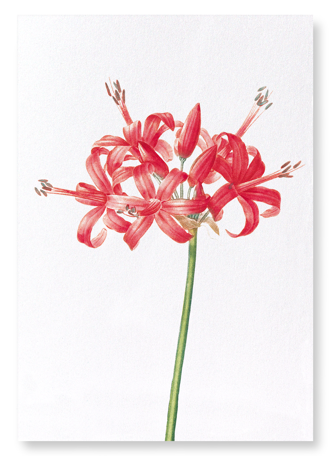 Amaryllis curvifolia, also known as nerine sarniensis, is not a true lily and is more closely related to the amaryllis - a flower commonly associated to determination, beauty, and love. Symbolic of success, they are commonly given as gifts of hard-won achievement. llustration by botanist Pierre-Joseph Redouté (1759–1840).