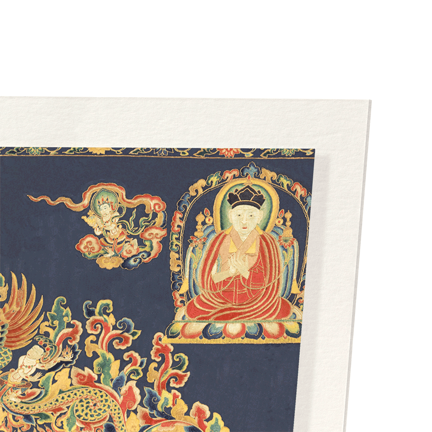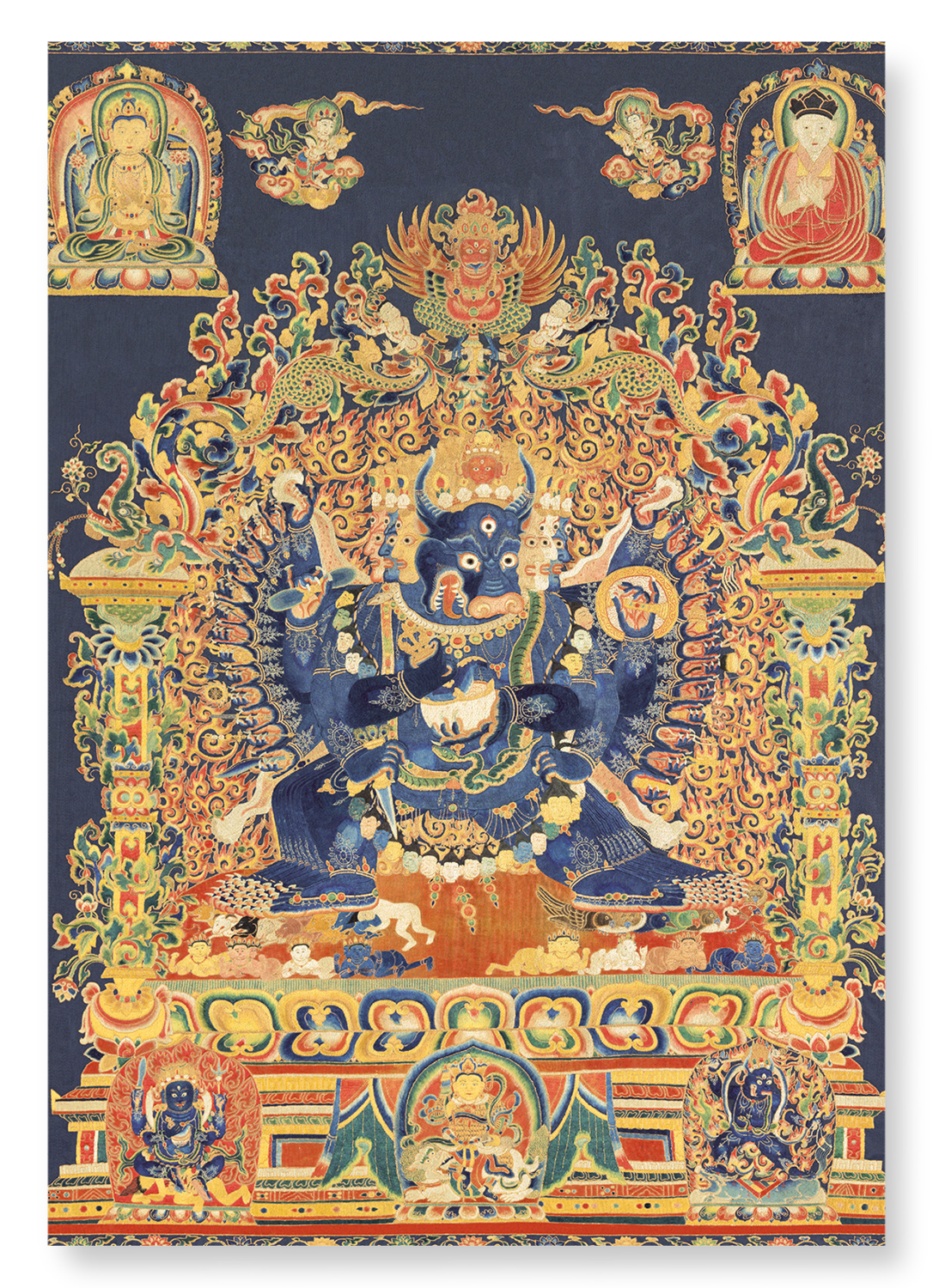 From a Chinese embroidery in silk, metallic thread and horsehair. Vajrabhairava scares selfishness and egoism - the main causes of suffering. It is one of the tantric manifestations of Manjushri, the Conqueror of Death, who represents the achievement of enlightenment by stopping the cycle of rebirth.