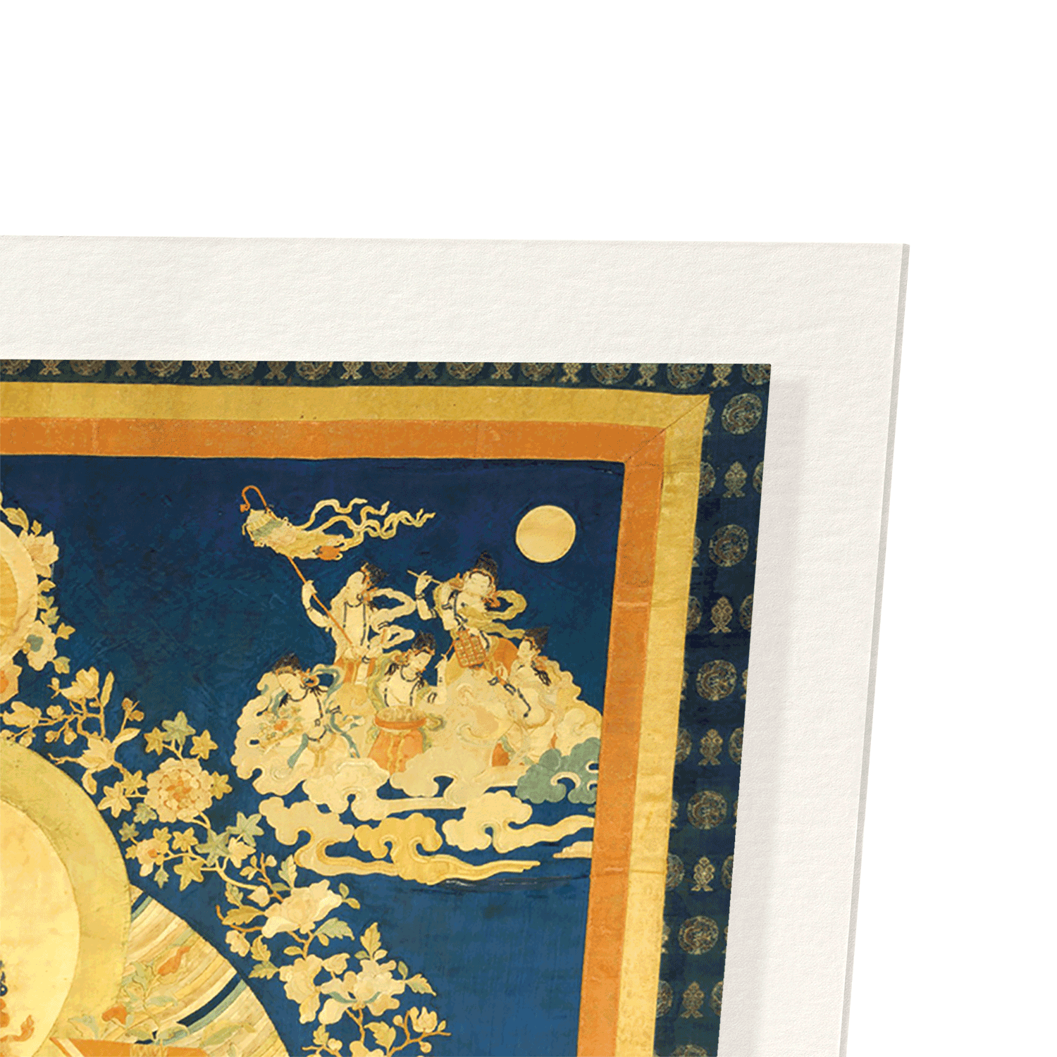 The Chinese silks and leather shapes skilfully portray the Bodhisattva Manjushri, whose name means Gentle Glory in Sanskrit. Considered a fully enlightened Buddha, the sword portrayed to left of the head represents the cutting away of delusion, and the book to the right, representing the Prajnaparamita - the Perfection of (Transcendent) Wisdom.