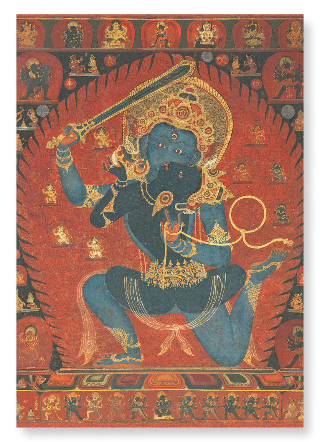 The painting from Nepal portrays the wrathful deity, also known as Acalanatha, depicted with his consort Vishvavajri. Achala is venerated as Budong Mingwang in China, in Japan as Fudo Myo - The Immovable Wisdom King.