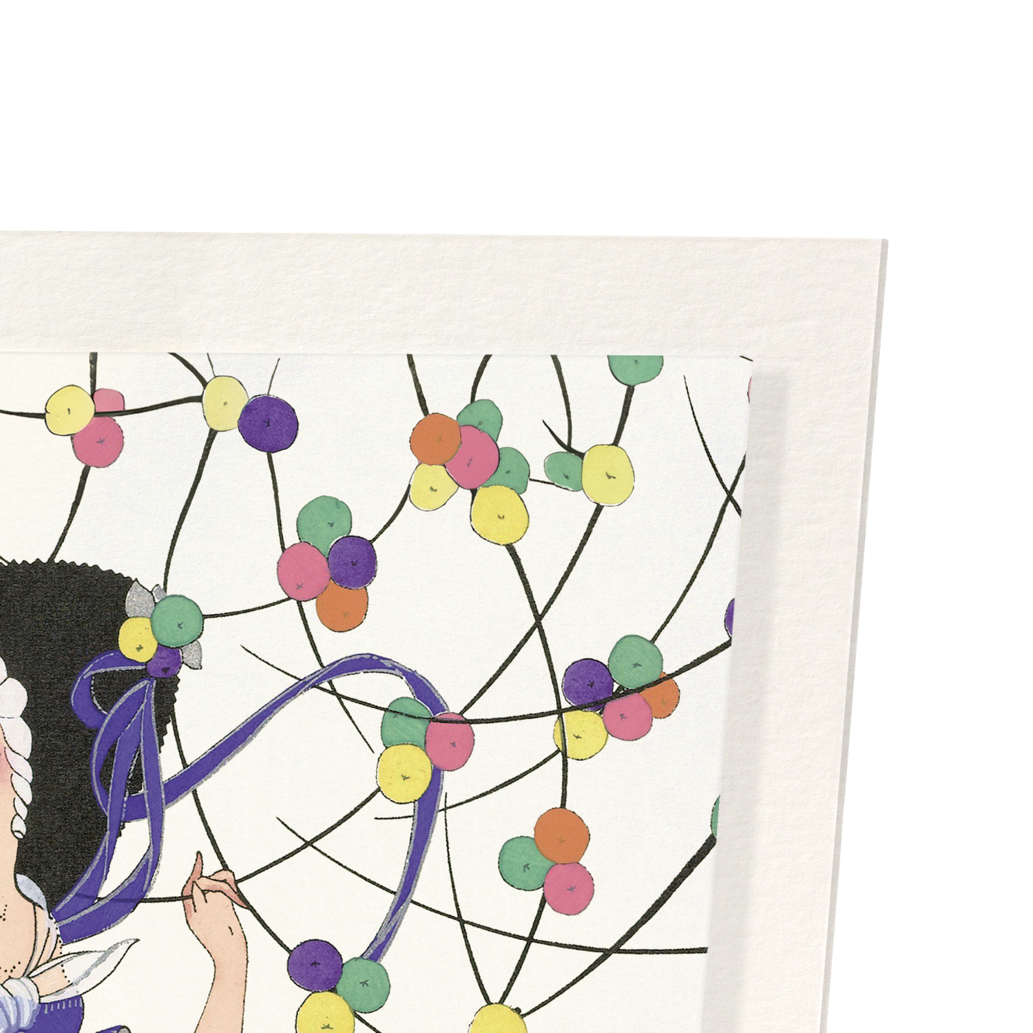 En 1919, Marthe Romme réalise une série de douze illustrations, chacune capturant l'essence d'un mois de l'année. Pour ‘Fructidor’, elle dessine une ample et volumineuse robe blanche, décorée de motifs de bandes verticales multicolores et de rubans bleus.