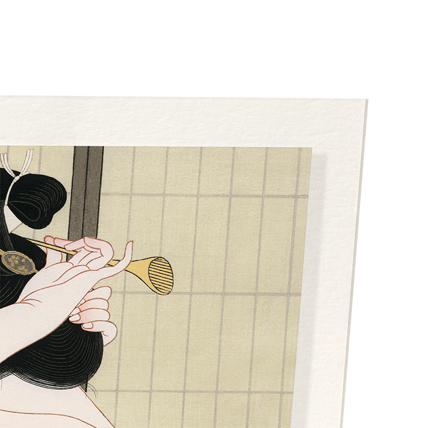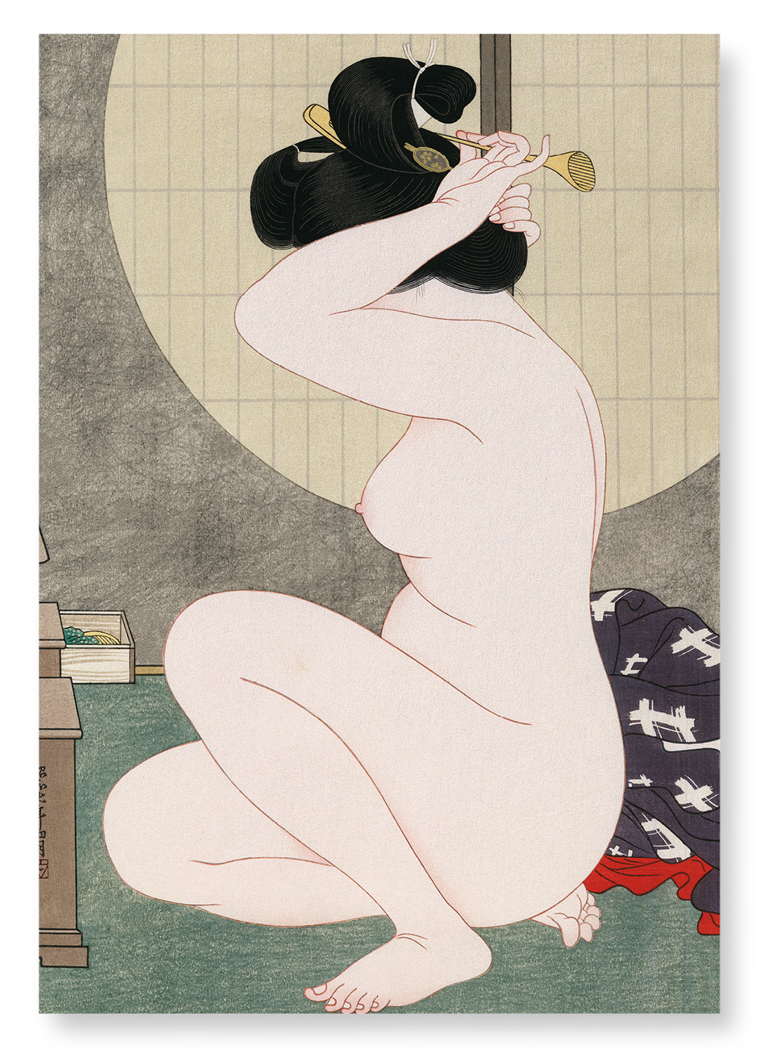 The artist Hakuho Hirano portrayed beautiful Japanese women as they dress or arrange their hair, often depicted from the side or back. This unusual perspective creates a voyeuristic intimacy, both distancing and drawing in the viewer.