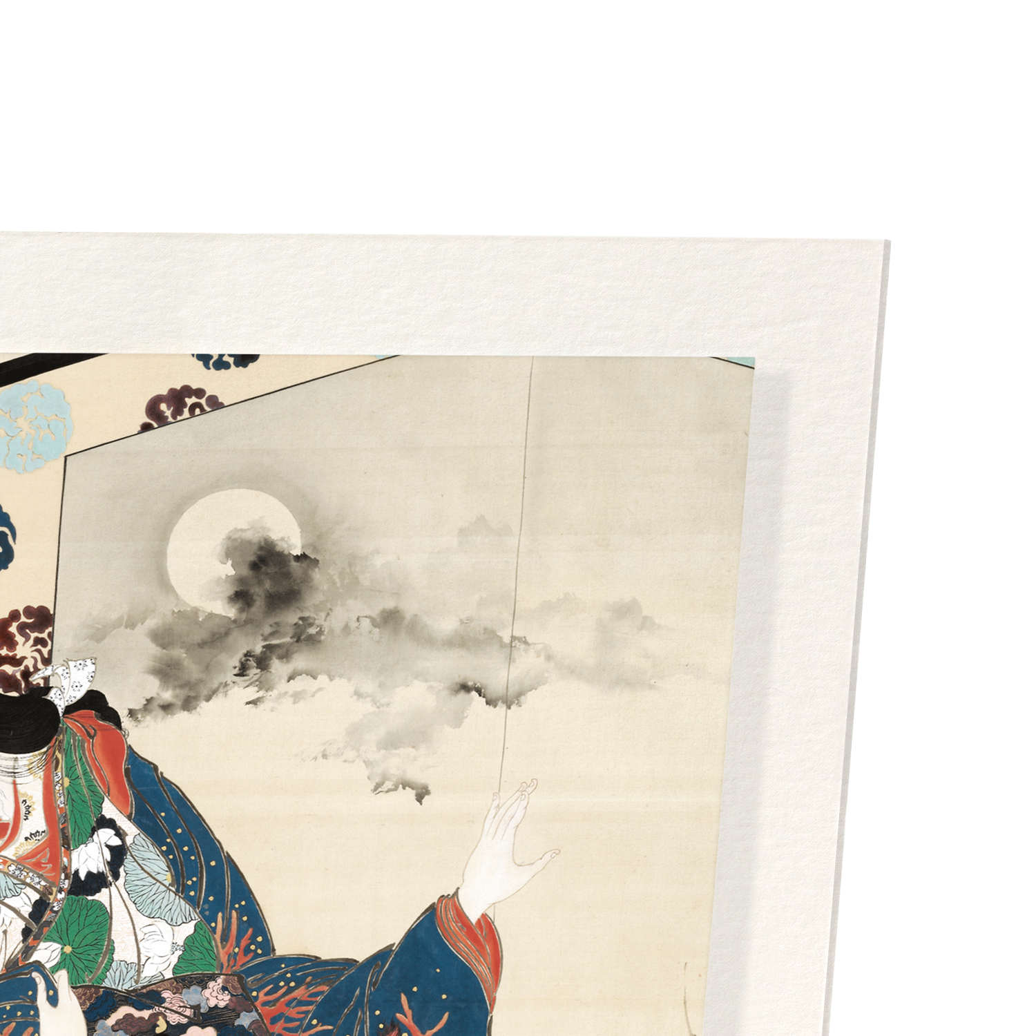 A beauty is shown before a screen. On her kimono the seven Japanese gods of fortune (shichifukujin) are shown. They provide her with protection that will guarantee a prosperous and long life full of wisdom. By artist Kawanabe Kyosai (1831-1889).