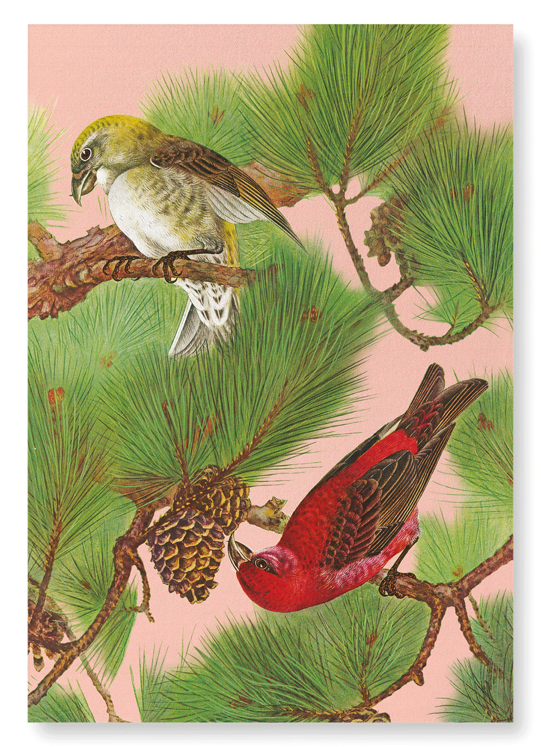 COMMON CROSSBILL BIRDS ON PINE TREE (C.1930): Japanese Art Print
