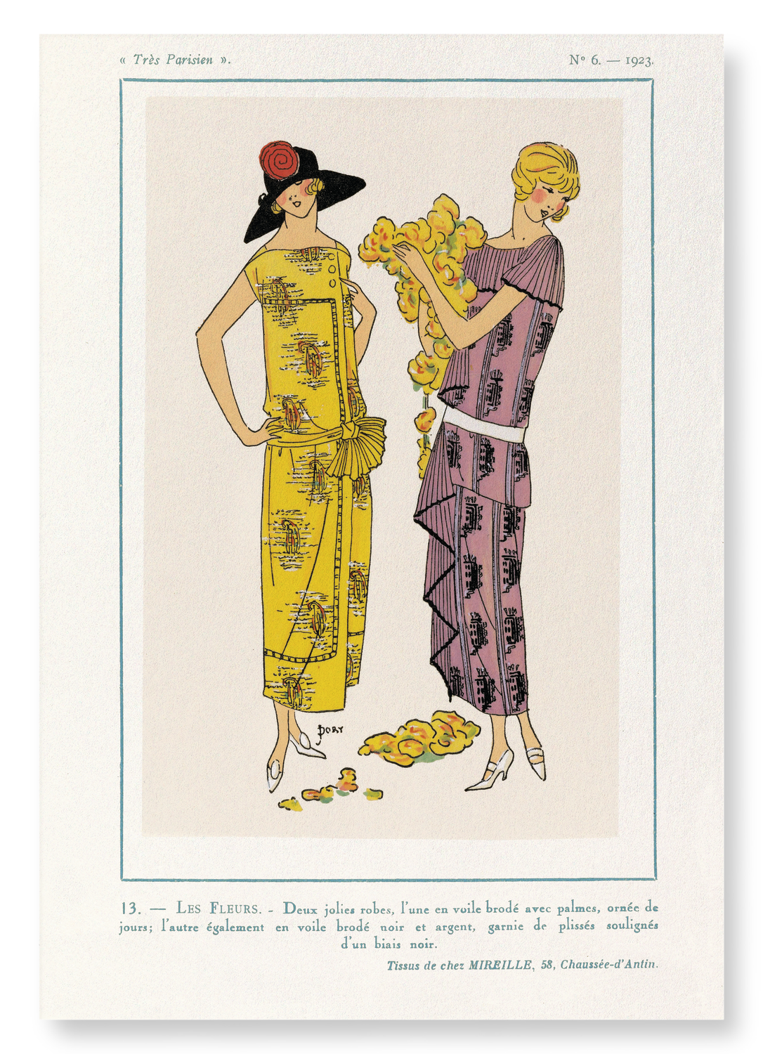 This 1923 illustration comes from the magazine Très Parisien known for its vividly coloured fashion drawings. This page shows two models wearing spring, modern dresses with flowery motifs embroidered on voile, the latest trend from Mireille.