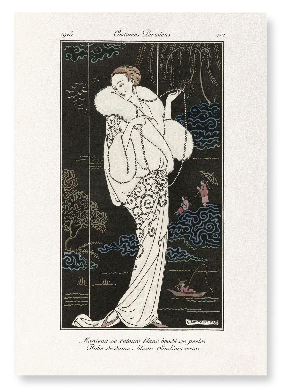 Illustration from "Journal des dames et des modes". The woman wears a white gown with a long, narrow skirt featuring a scrolling pattern created with embroidered pearls under a white velvet coat with fur.