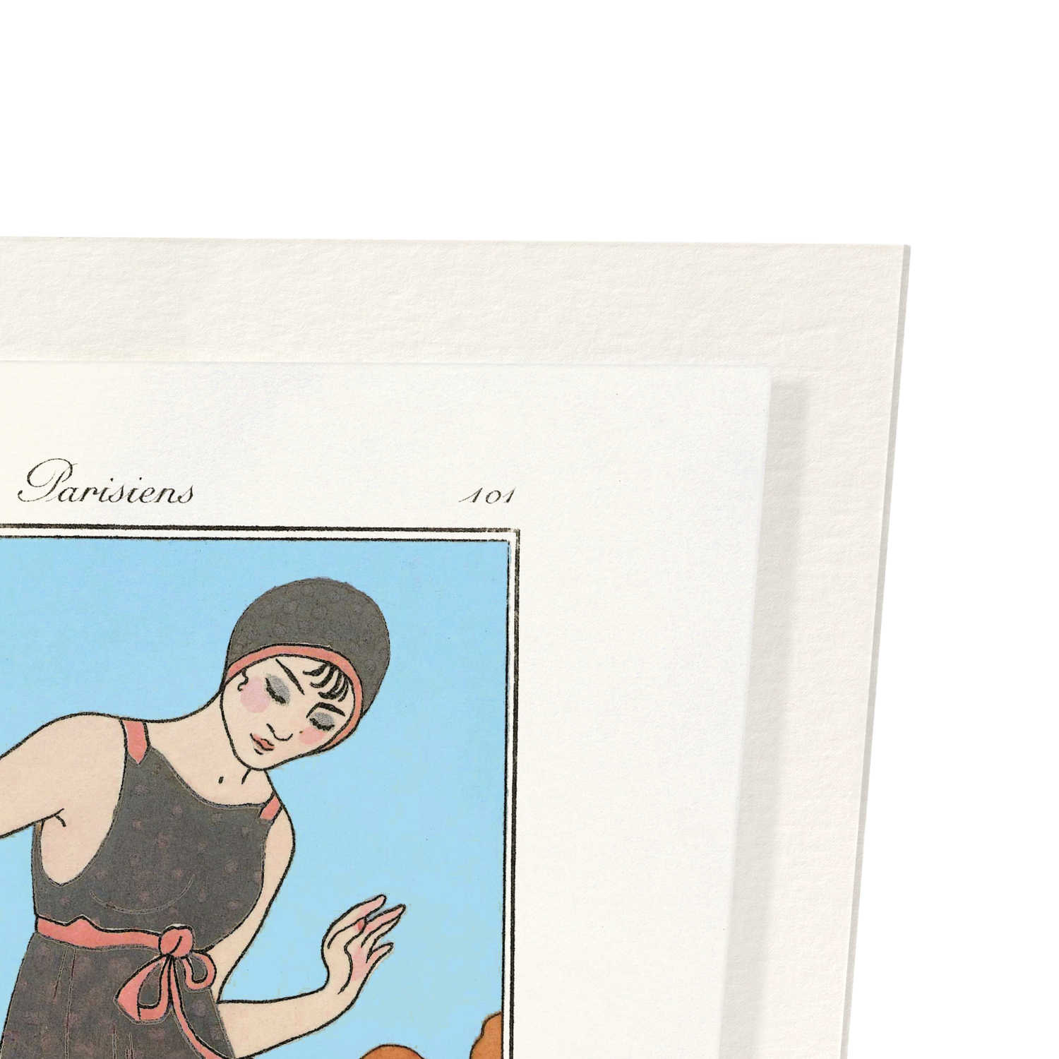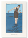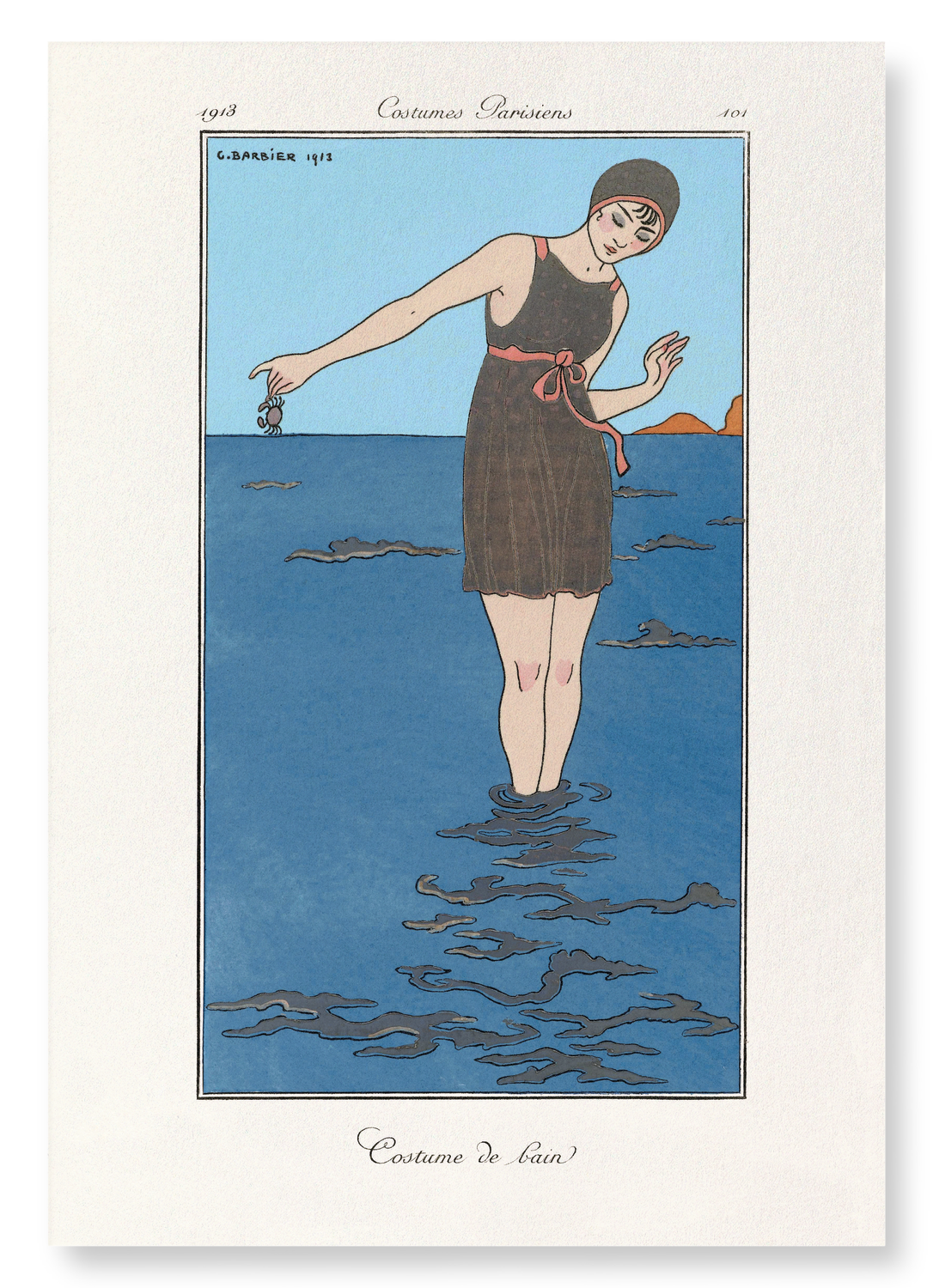 Until the 1900s, the swimming suit covered the woman’s body. In 1913, it was transformed into a tight-fitting, sleeveless, one-piece swimsuit as illustrated in this example by George Barbier. These one-piece swimsuits were soon available at the fashionable department stores.