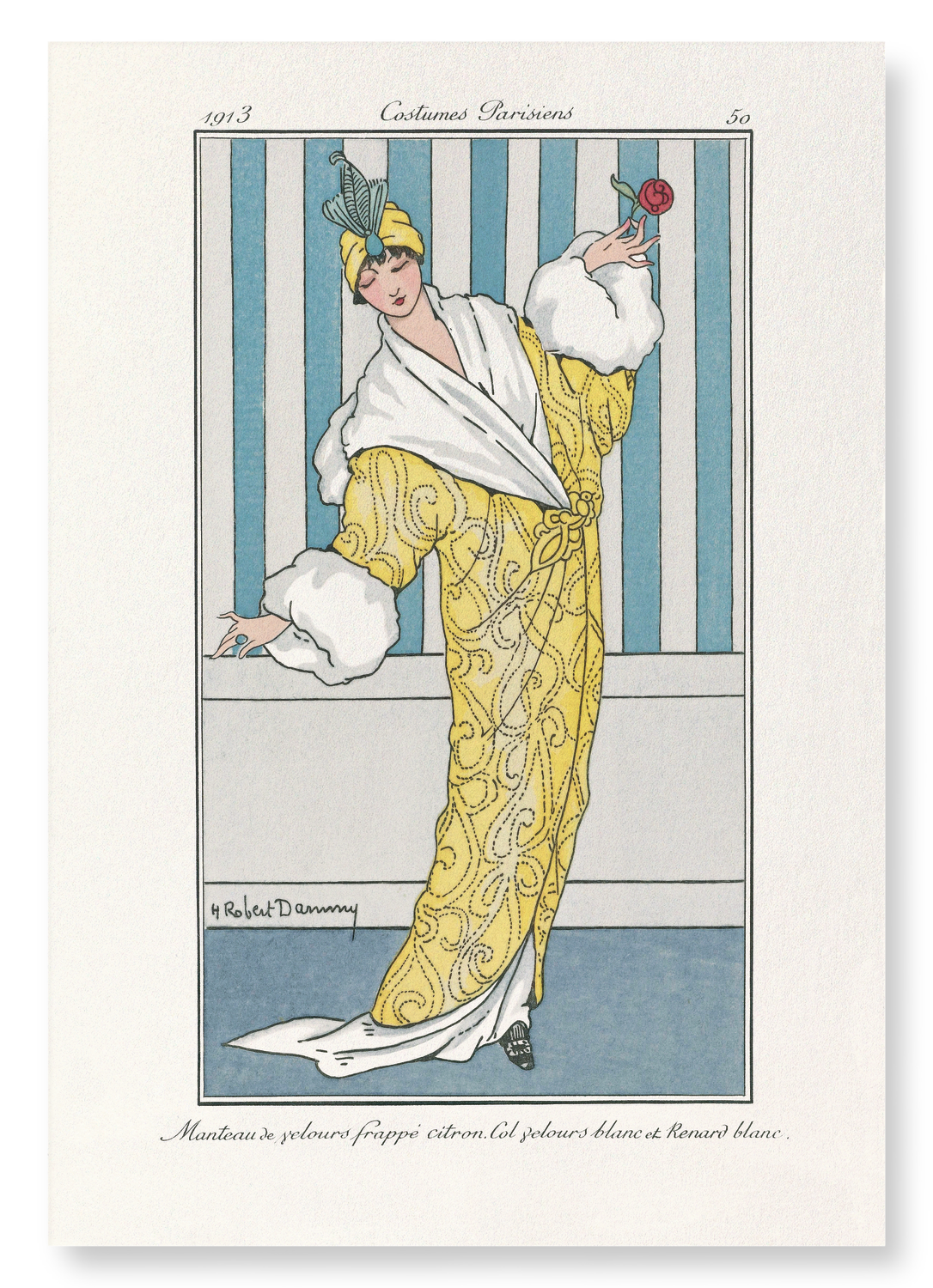 Illustration by H. Robert Dammy for "Journal des dames et des modes" in 1913. The woman wears a coat of lemon yellow 'velours frappé' (velvet) with a collar of white velvet and white fox fur.