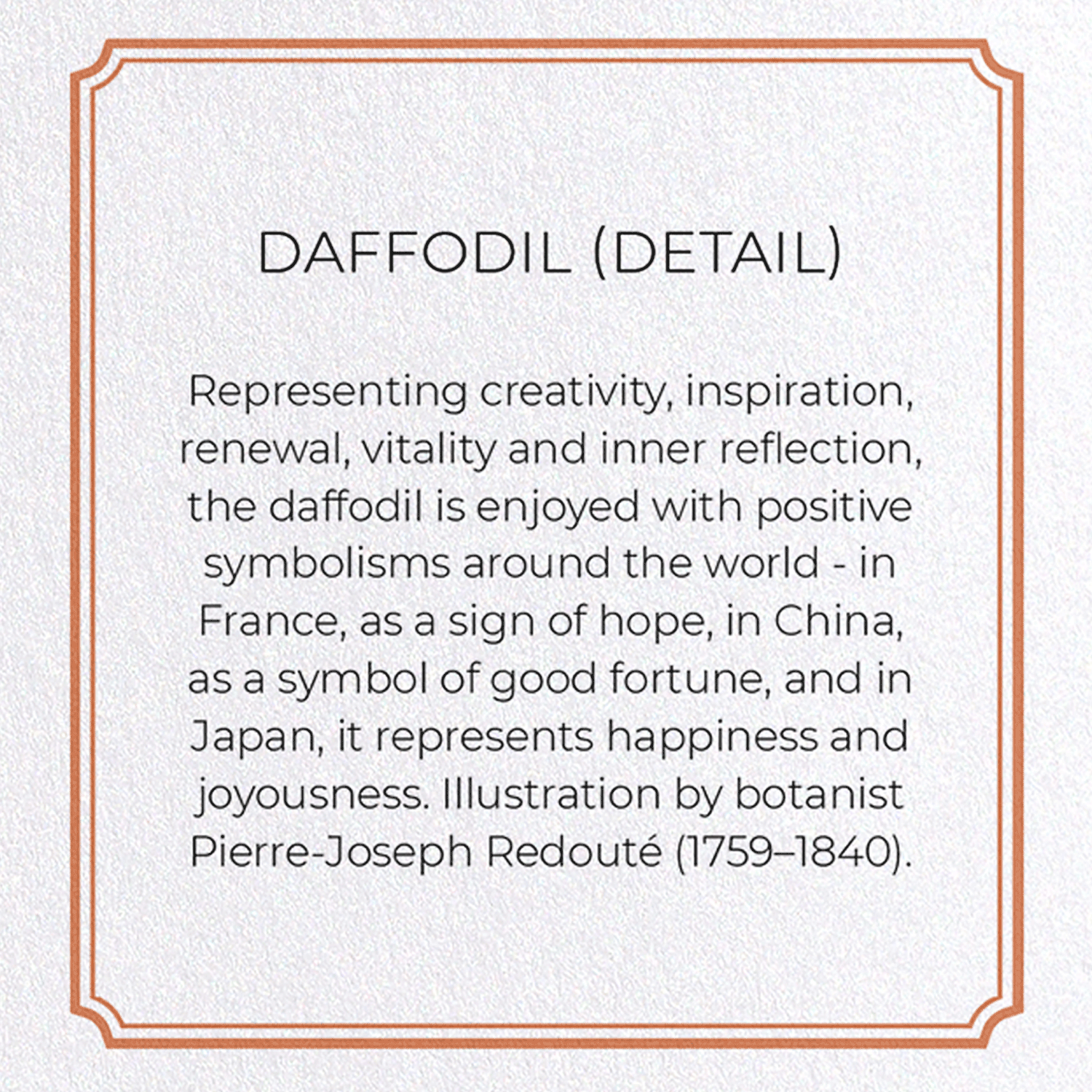 Representing creativity, inspiration, renewal, vitality and inner reflection, the daffodil is enjoyed with positive symbolisms around the world - in France, as a sign of hope, in China, as a symbol of good fortune, and in Japan, it represents happiness and joyousness. Illustration by botanist Pierre-Joseph Redouté (1759–1840).