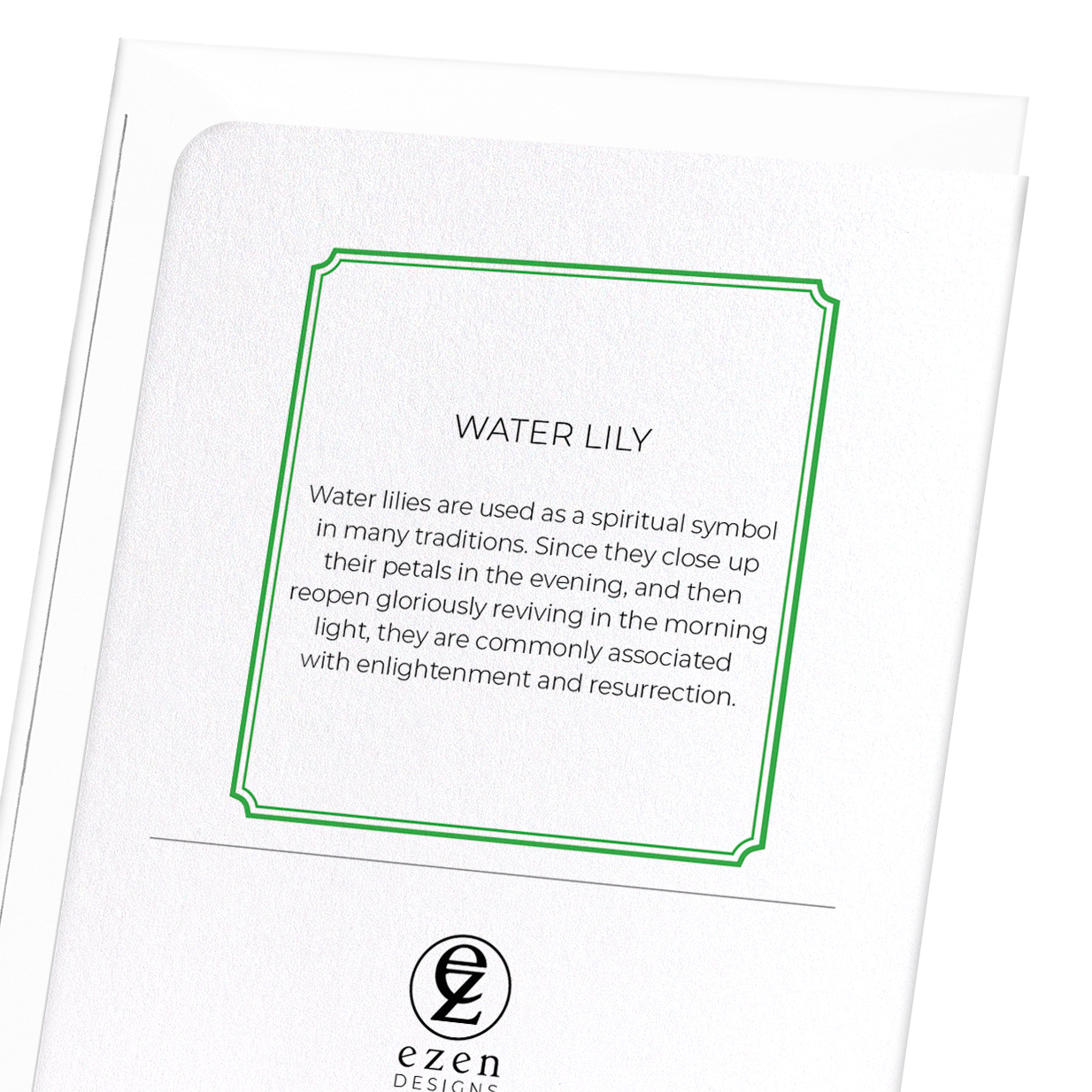 Water lilies are used as a spiritual symbol in many traditions. Since they close up their petals in the evening, and then reopen gloriously reviving in the morning light, they are commonly associated with enlightenment and resurrection.