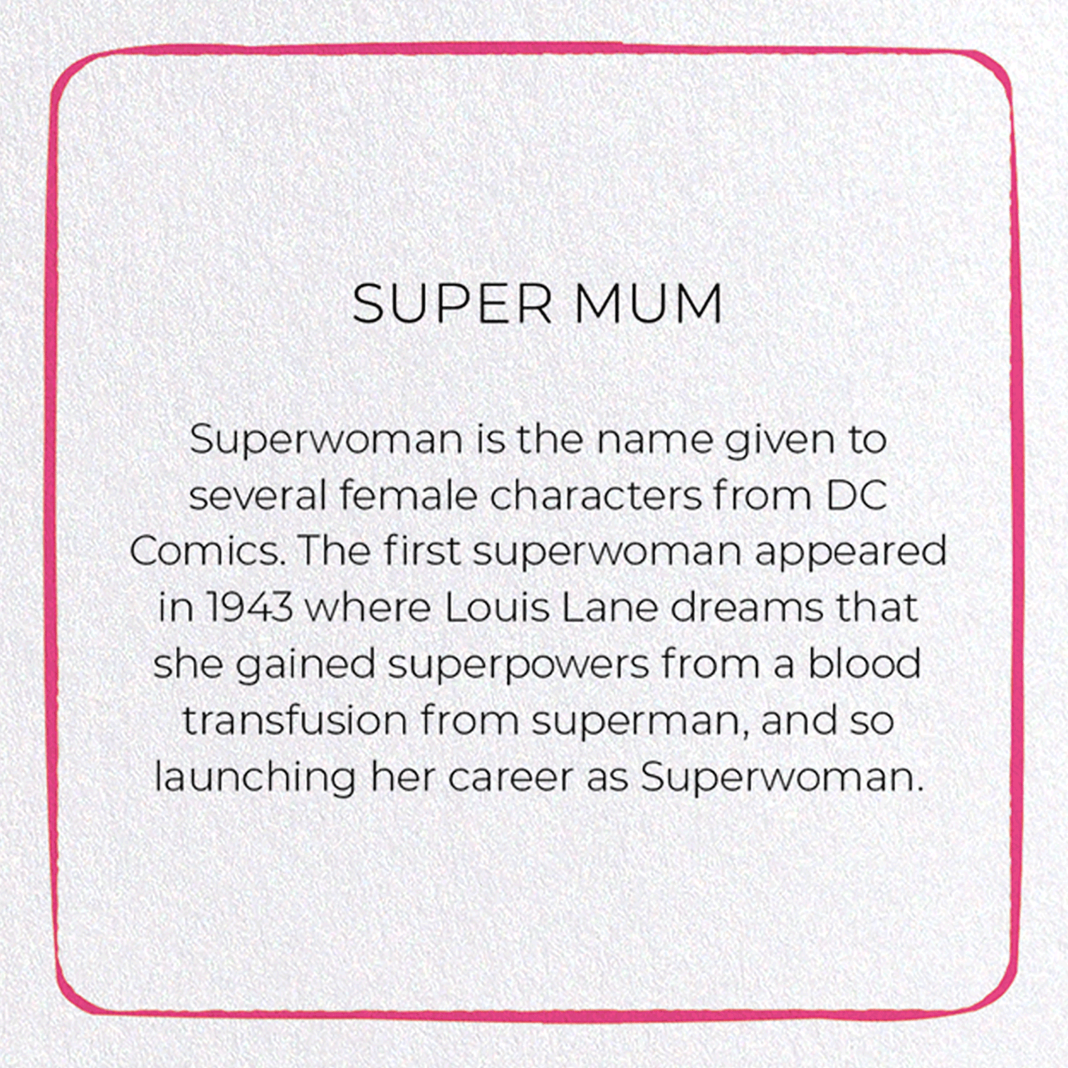 Superwoman is the name given to several female characters from DC Comics. The first superwoman appeared in 1943 where Louis Lane dreams that she gained superpowers from a blood transfusion from superman, and so launching her career as Superwoman.