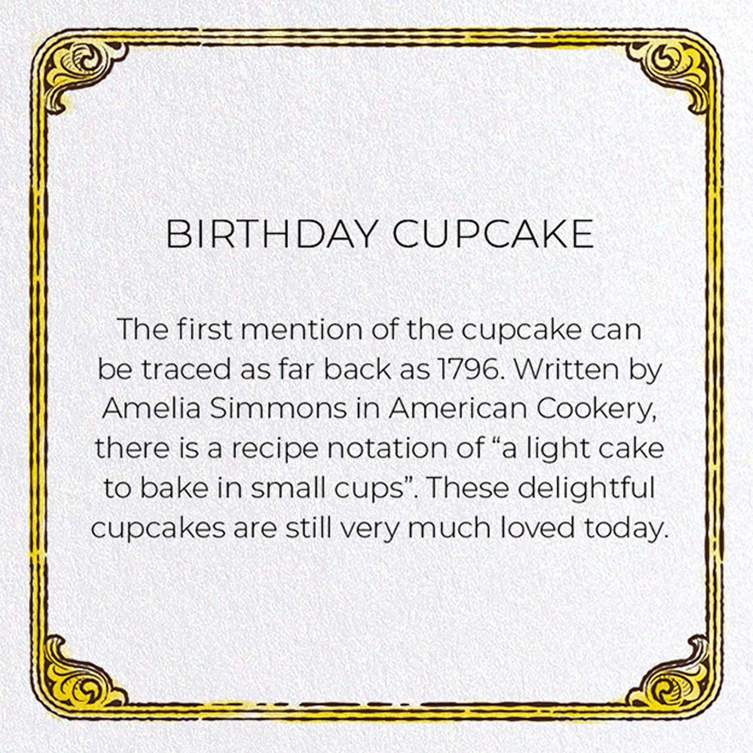 The first mention of the cupcake can be traced as far back as 1796. Written by Amelia Simmons in American Cookery, there is a recipe notation of “a light cake to bake in small cups”. These delightful cupcakes are still very much loved today.