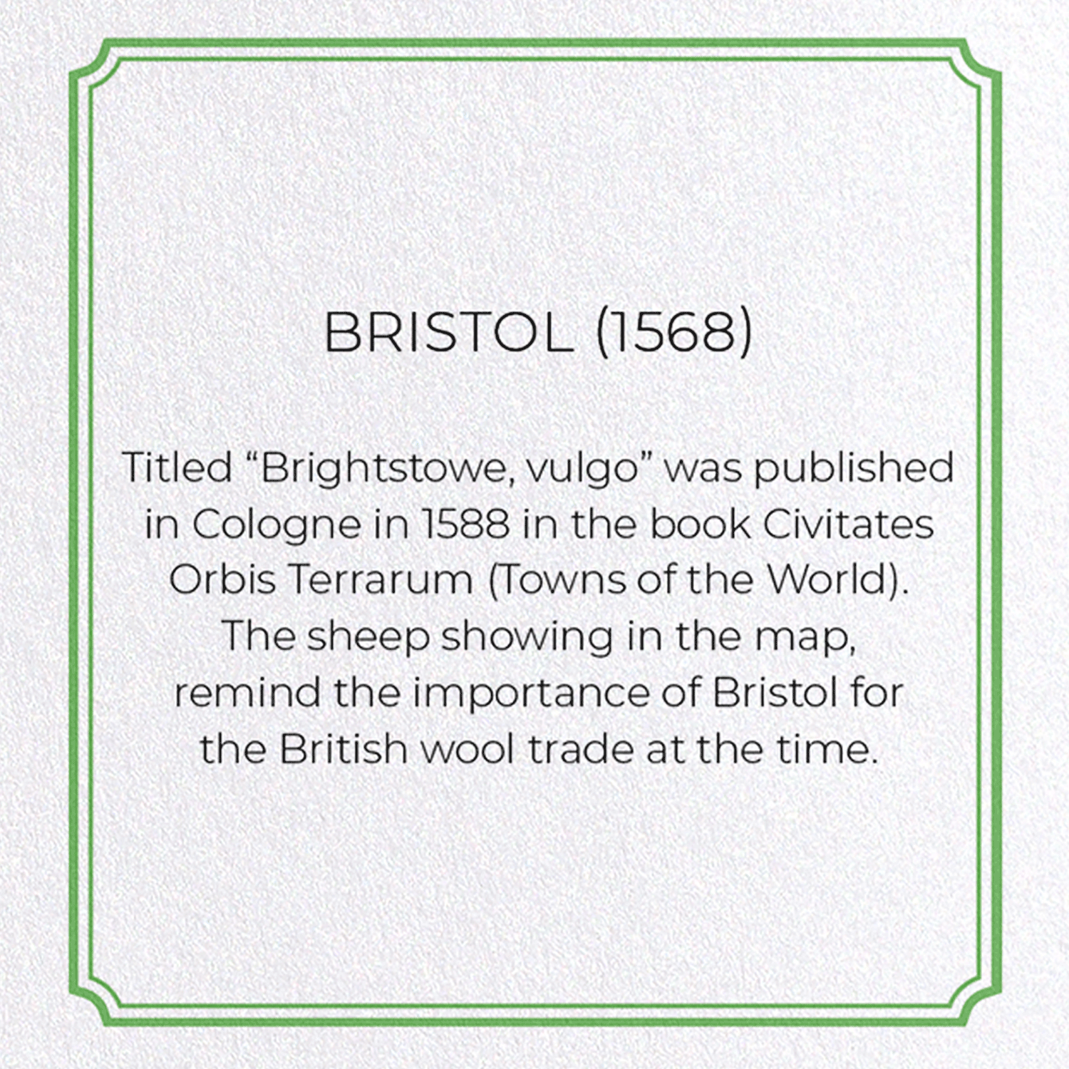 Titled "Brightstowe, vulgo" was published in Cologne in 1588 in the book Civitates Orbis Terrarum (Towns of the World). The sheep showing in the map, remind the importance of Bristol for the British wool trade at the time.
