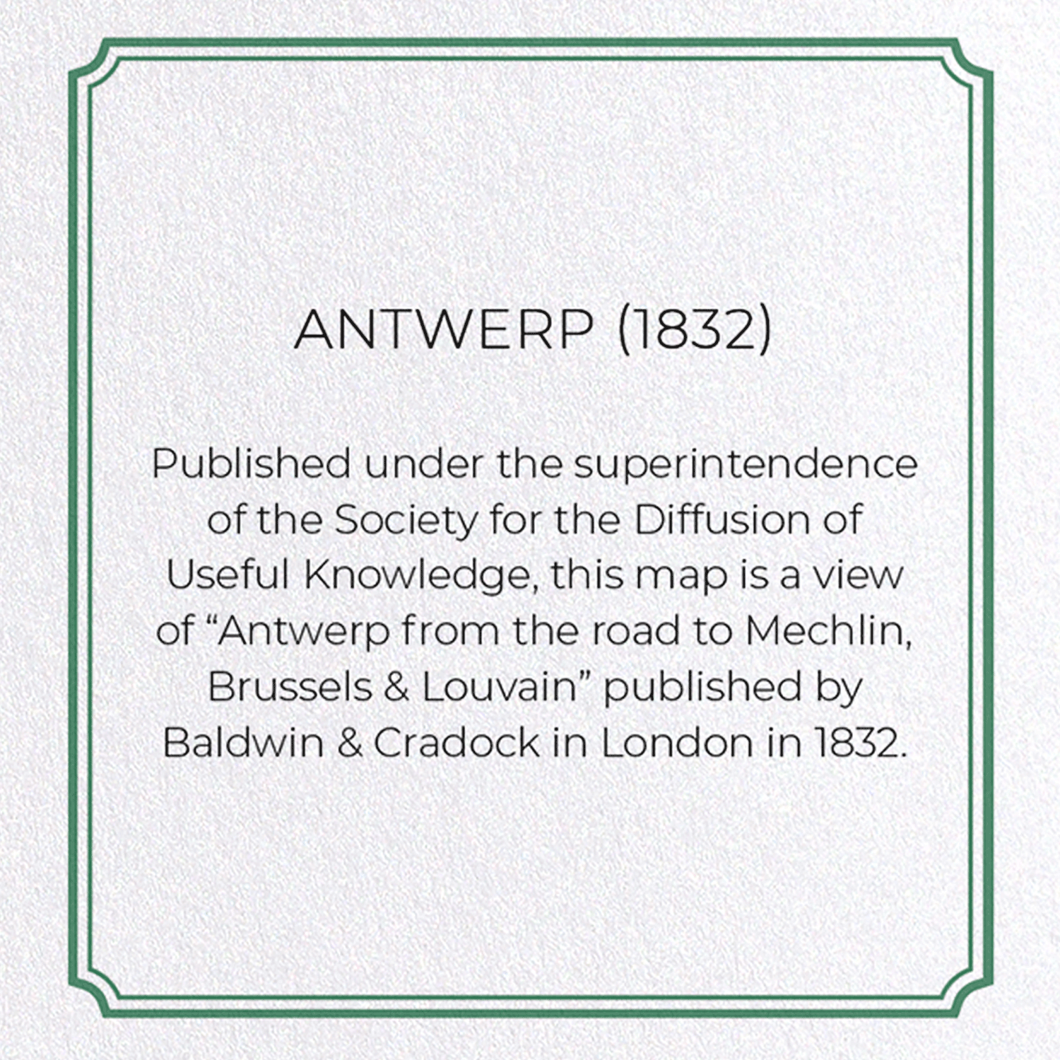 Published under the superintendence of the Society for the Diffusion of Useful Knowledge, this map is a view of “Antwerp from the road to Mechlin, Brussels & Louvain” published by Baldwin & Cradock in London in 1832.