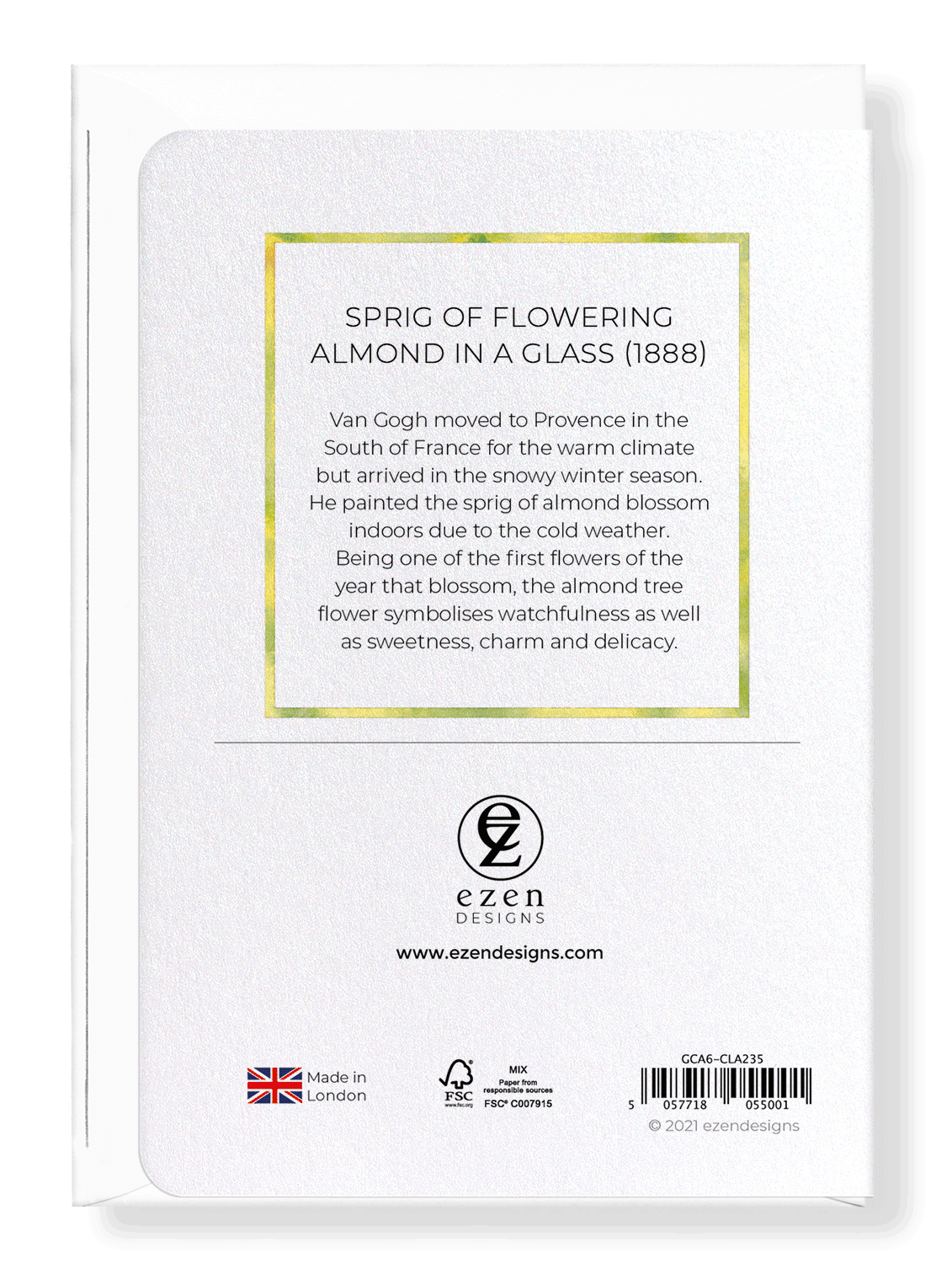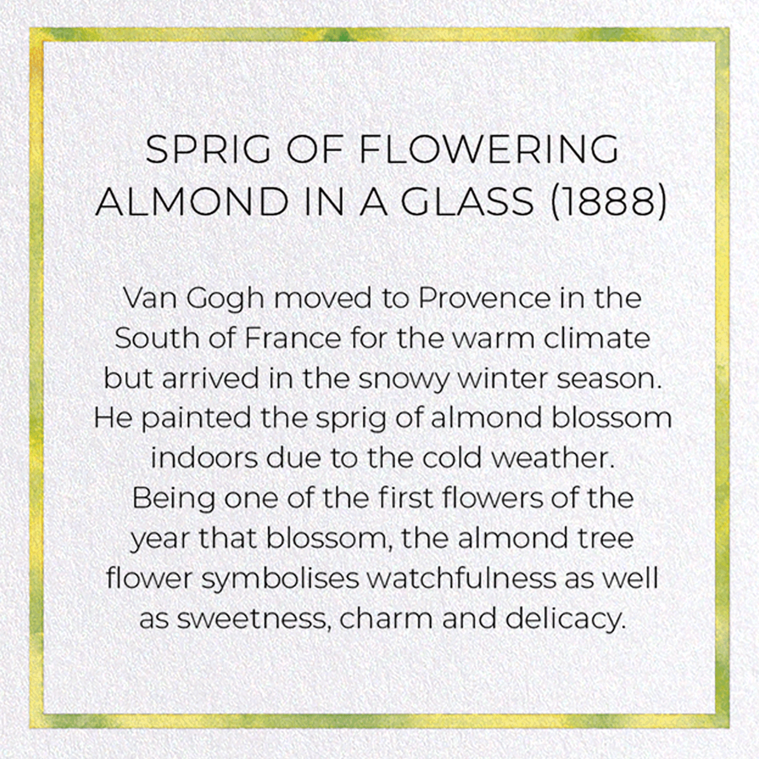 Van Gogh moved to Provence in the South of France for the warm climate but arrived in the snowy winter season. He painted the sprig of almond blossom indoors due to the cold weather. Being one of the first flowers of the year that blossom, the almond tree flower symbolises watchfulness as well as sweetness, charm and delicacy.