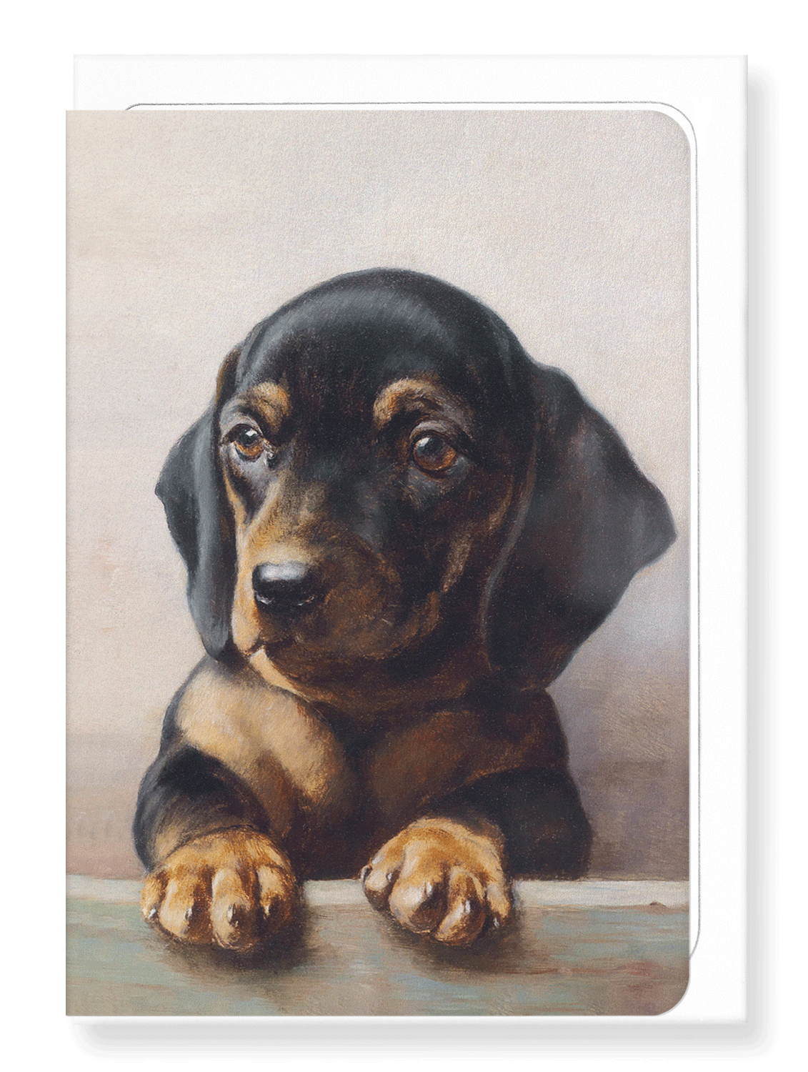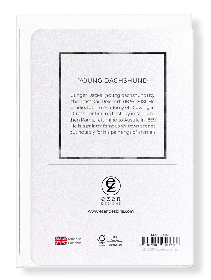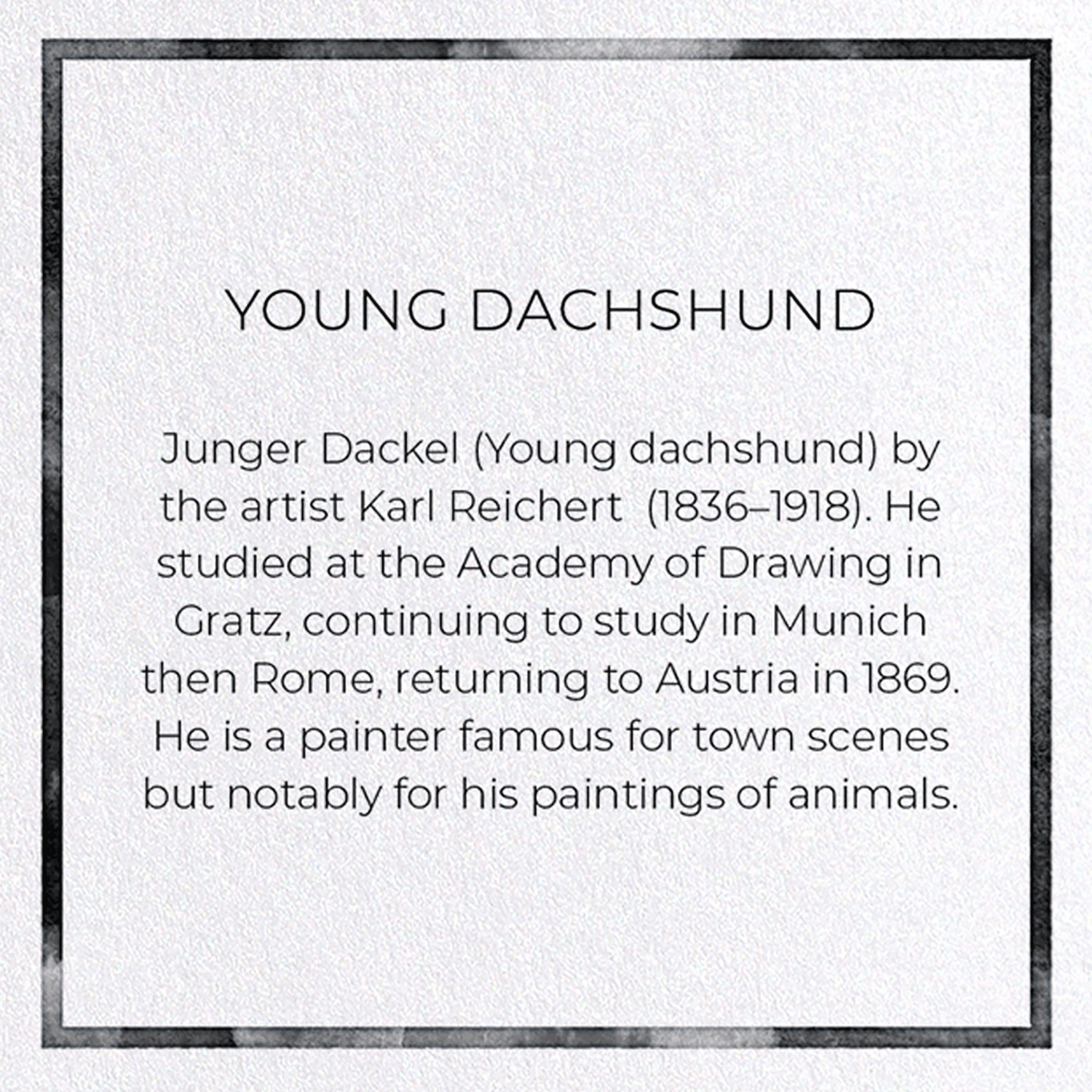 Junger Dackel (Young dachshund) by the artist Karl Reichert (1836–1918). He studied at the Academy of Drawing in Gratz, continuing to study in Munich then Rome, returning to Austria in 1869. He is a painter famous for town scenes but notably for his paintings of animals.