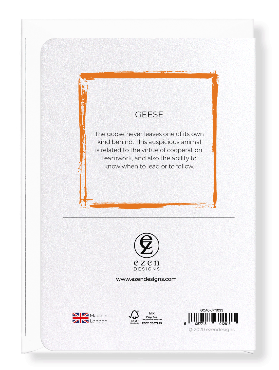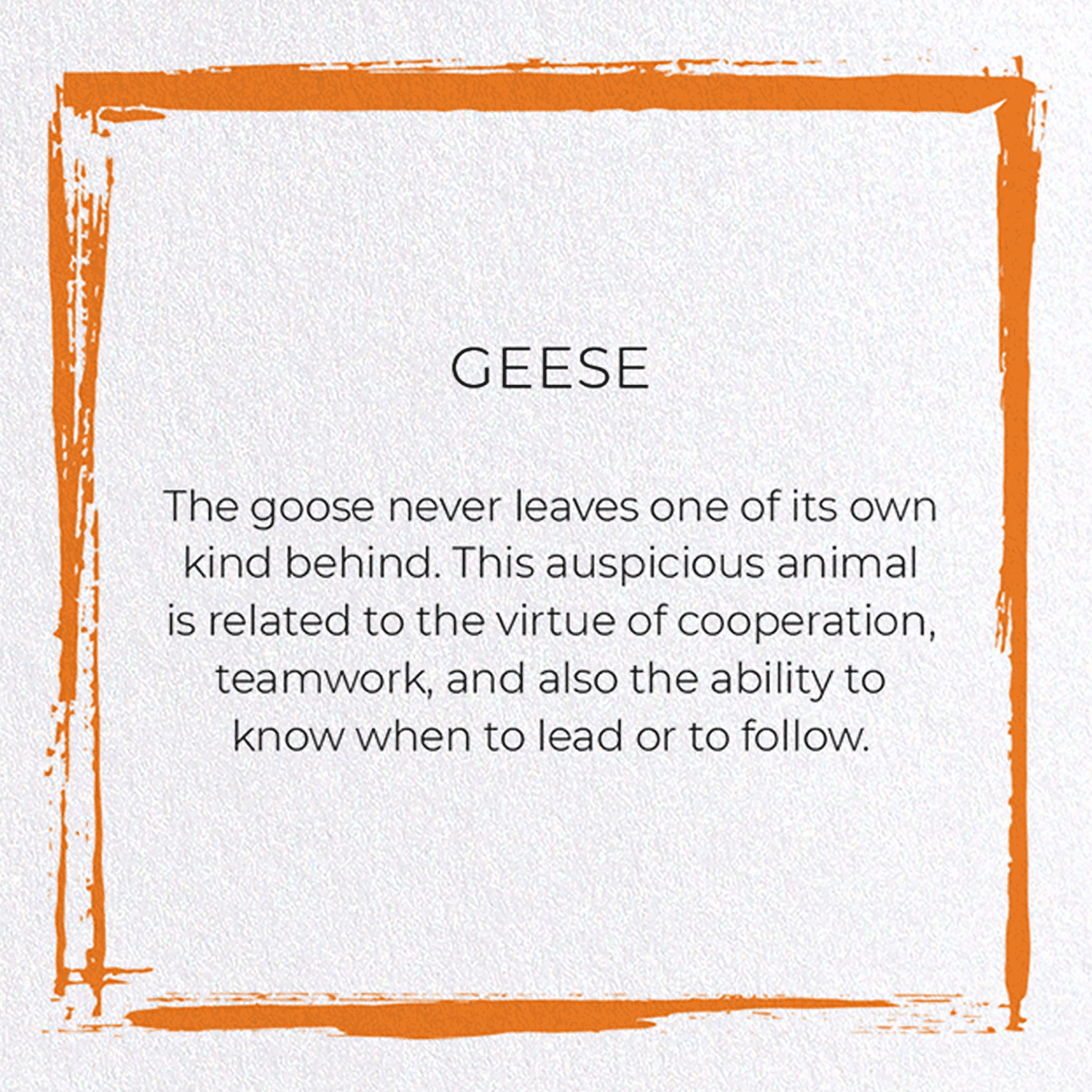 The goose never leaves one of its own kind behind. This auspicious animal is related to the virtue of cooperation, teamwork, and also the ability to know when to lead or to follow.