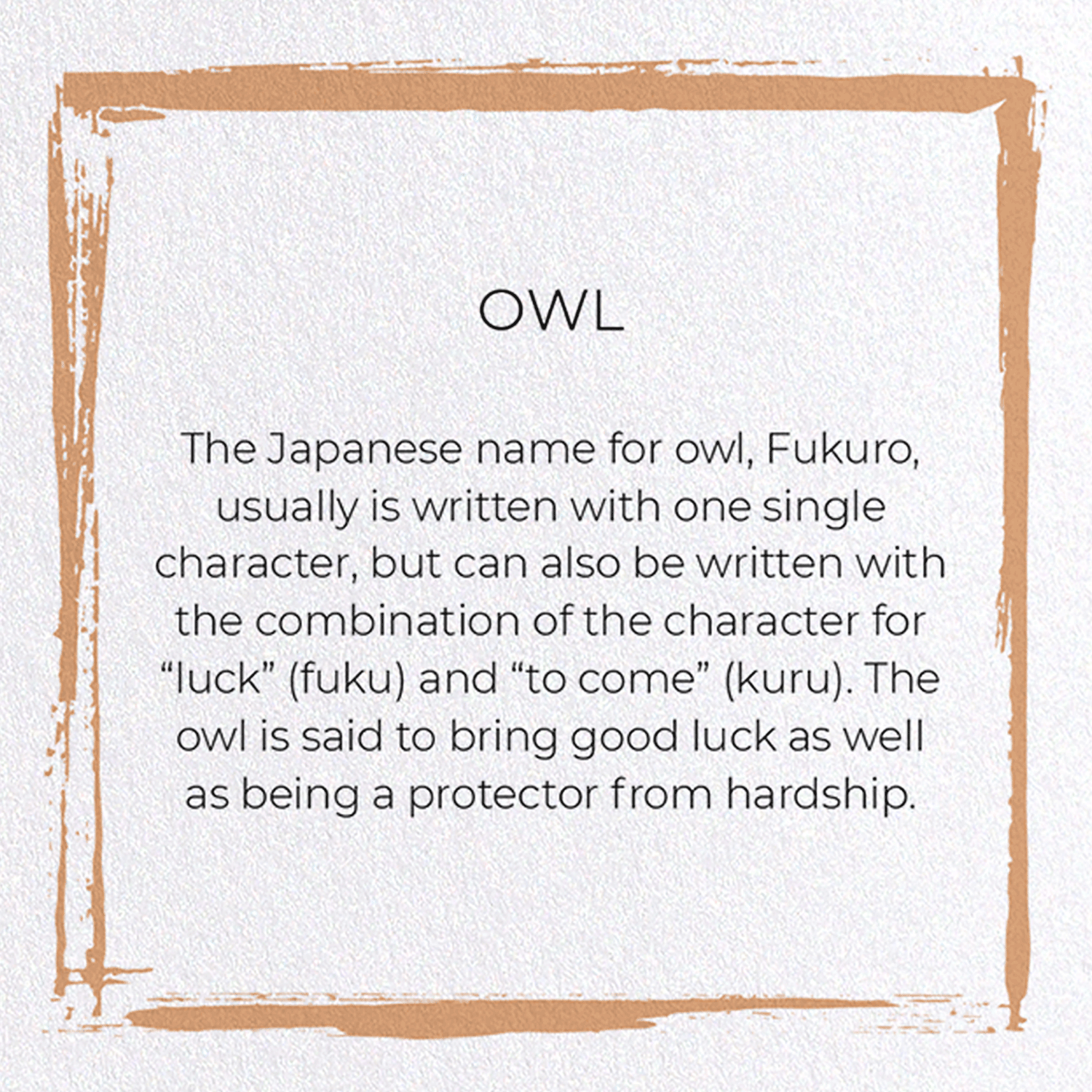 The Japanese name for owl, Fukuro, usually is written with one single character, but can also be written with the combination of the character for "luck" (fuku) and "to come" (kuru). The owl is said to bring good luck as well as being a protector from hardship.