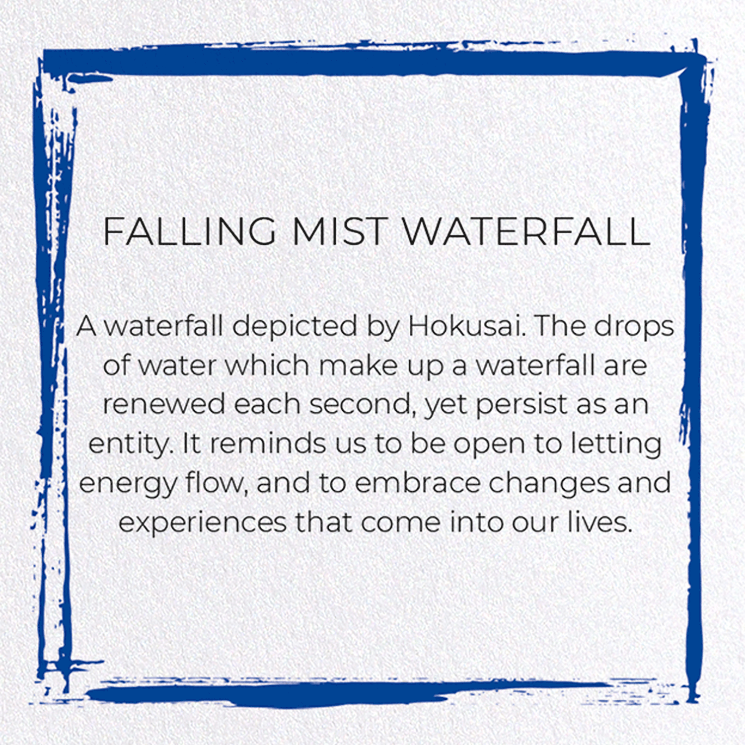 A waterfall depicted by Hokusai. The drops of water which make up a waterfall are renewed each second, yet persist as an entity. It reminds us to be open to letting energy flow, and to embrace changes and experiences that come into our lives.
