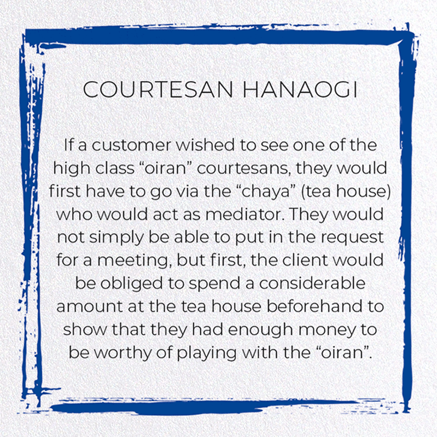 If a customer wished to see one of the high class “oiran” courtesans, they would first have to go via the “chaya” (tea house) who would act as mediator. They would not simply be able to put in the request for a meeting, but first, the client would be obliged to spend a considerable amount at the tea house beforehand to show that they had enough money to be worthy of playing with the “oiran”.