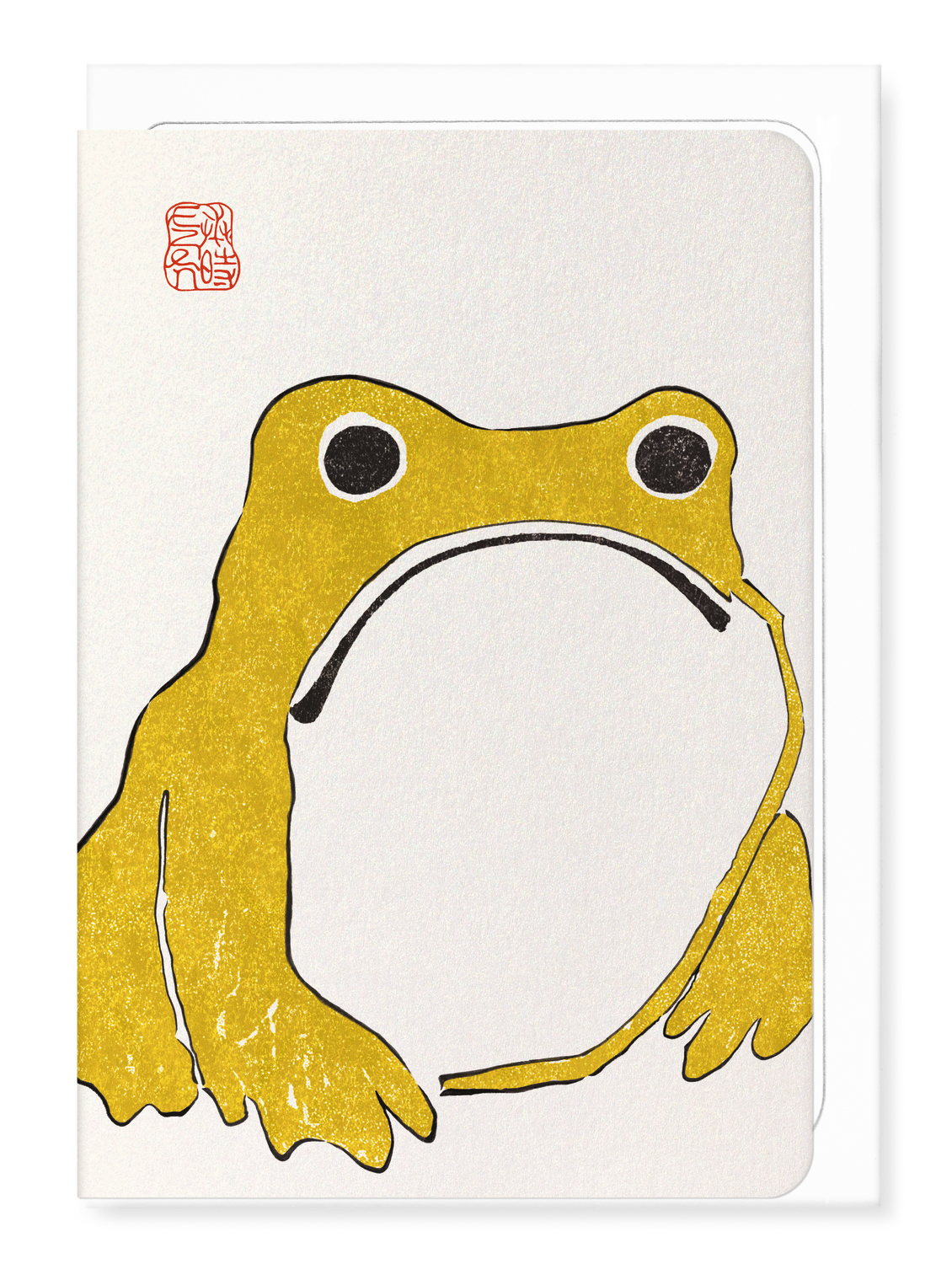 A contemporary yellow adaptation of a Japanese woodblock print dating 1814. The Japanese word for frog is “kaeru”, which can also mean “to return”, so the frog is considered to bring good luck, representing good things returning.