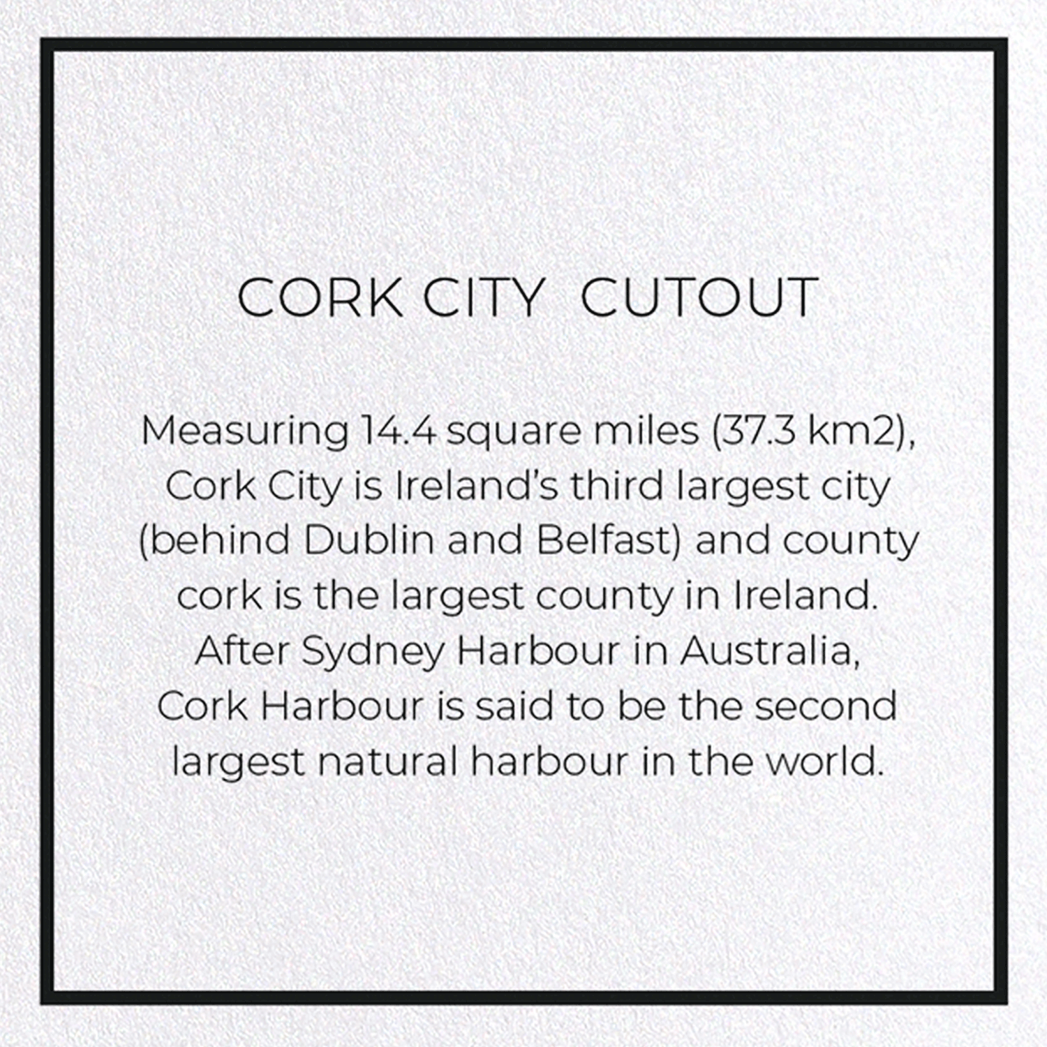 Measuring 14.4 square miles (37.3 km2), Cork City is Ireland's third largest city (behind Dublin and Belfast) and county cork is the largest county in Ireland. After Sydney Harbour in Australia, Cork Harbour is said to be the second largest natural harbour in the world.