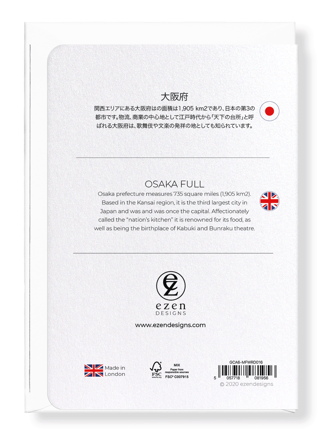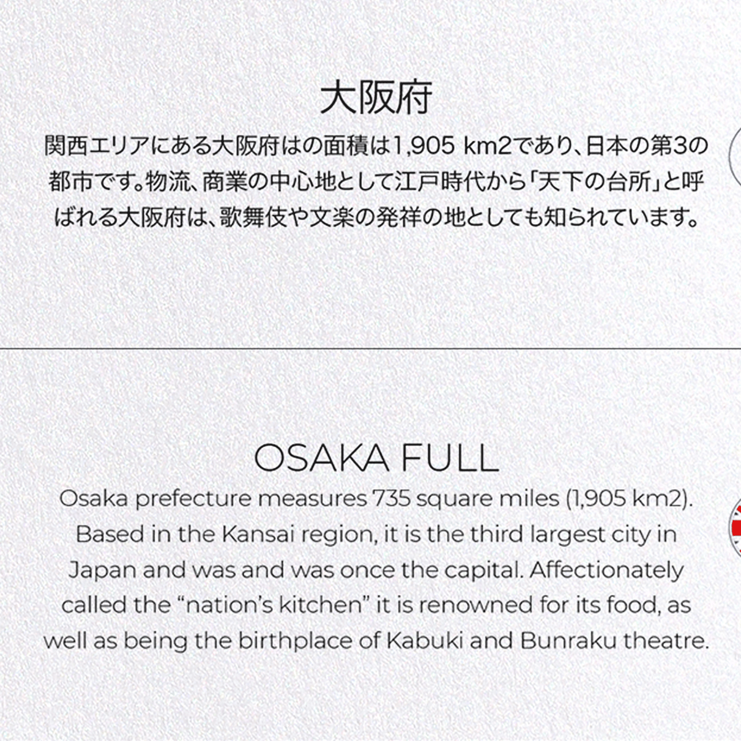 Osaka prefecture measures 735 square miles (1,905 km2). Based in the Kansai region, it is the third largest city in Japan and was and was once the capital. Affectionately called the "nation's kitchen" it is renowned for its food, as well as being the birthplace of Kabuki and Bunraku theatre.