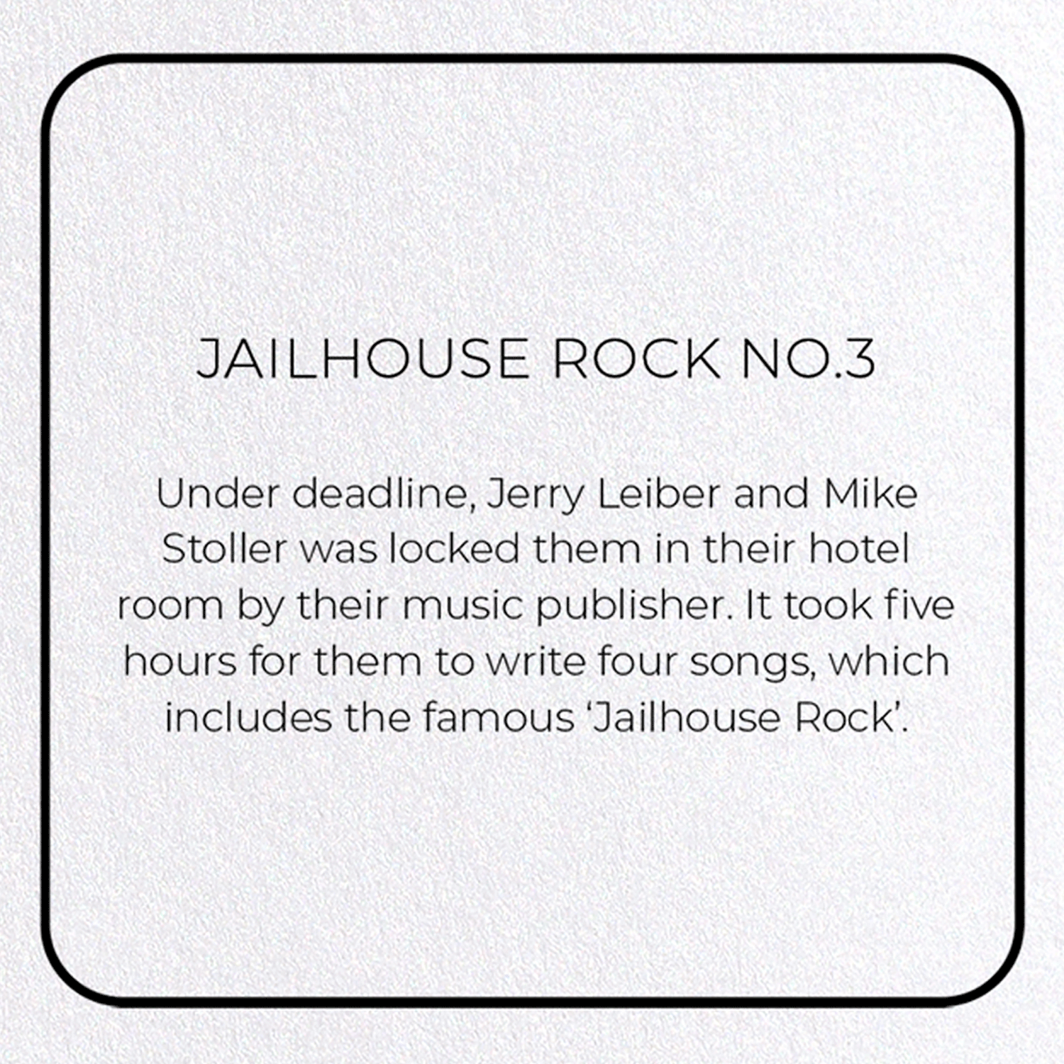 Under deadline, Jerry Leiber and Mike Stoller was locked them in their hotel room by their music publisher. It took five hours for them to write four songs, which includes the famous 'Jailhouse Rock'.