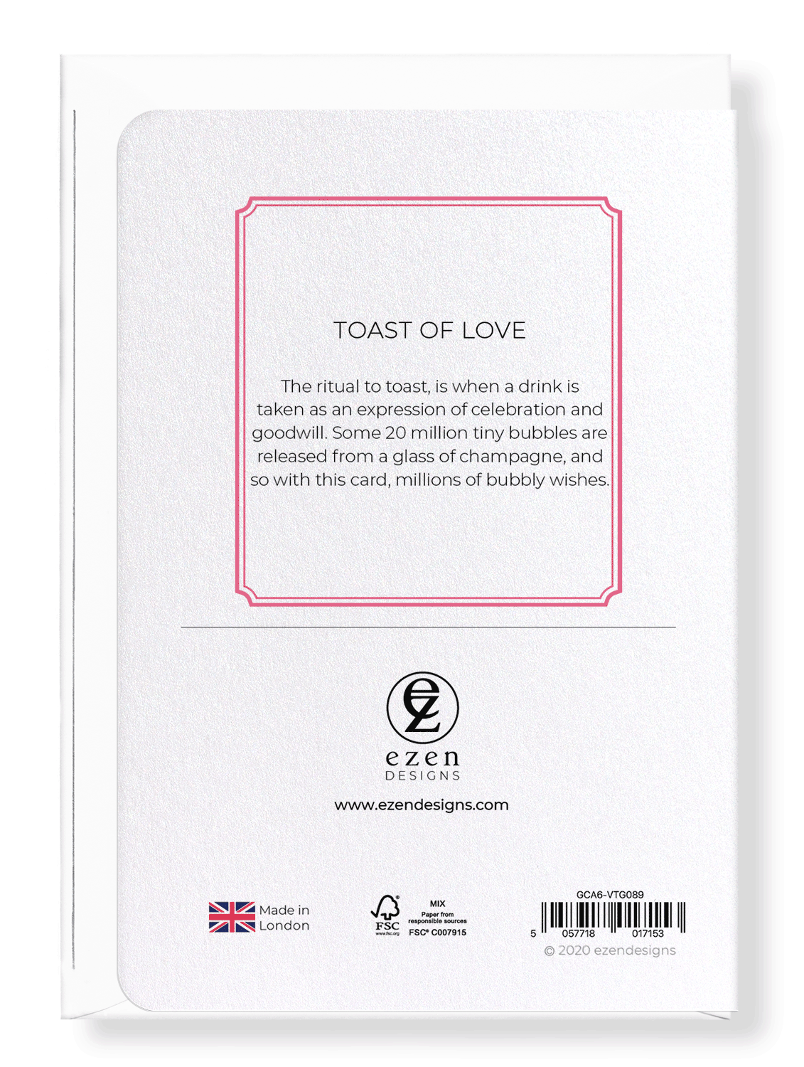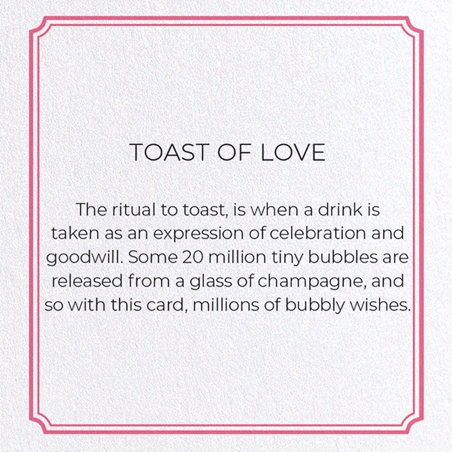 The ritual to toast, is when a drink is taken as an expression of celebration and goodwill. Some 20 million tiny bubbles are released from a glass of champagne, and so with this card, millions of bubbly wishes.